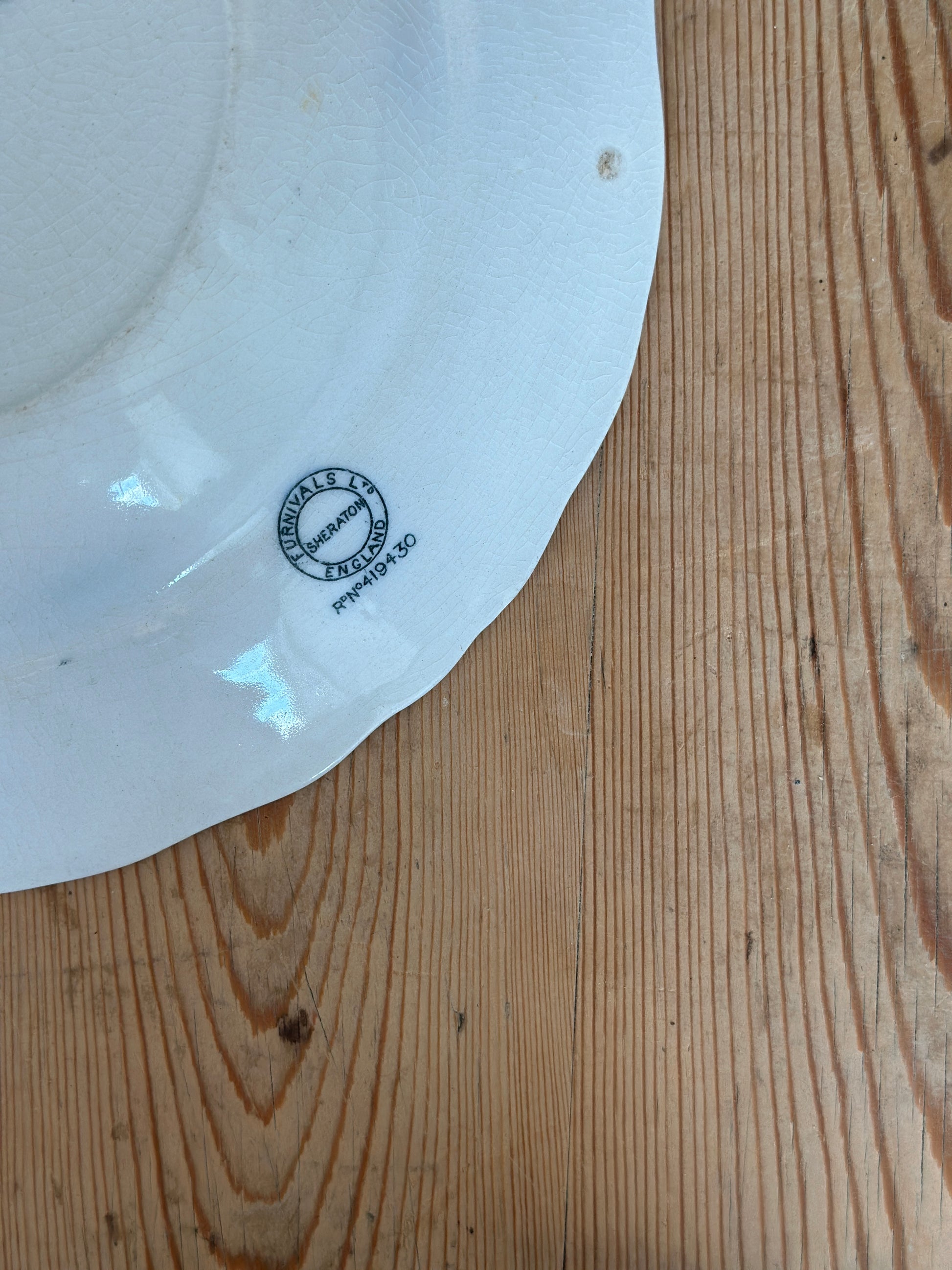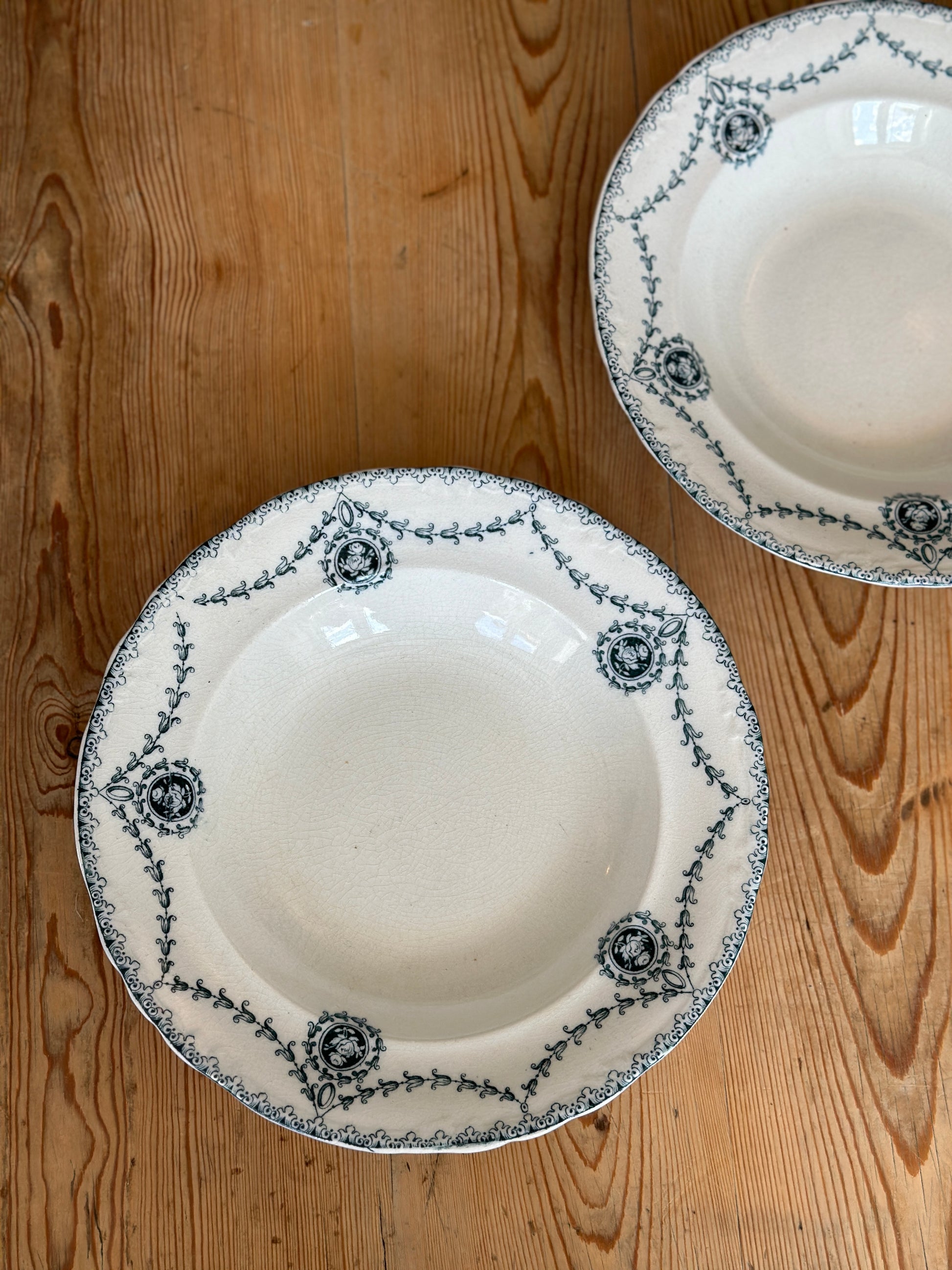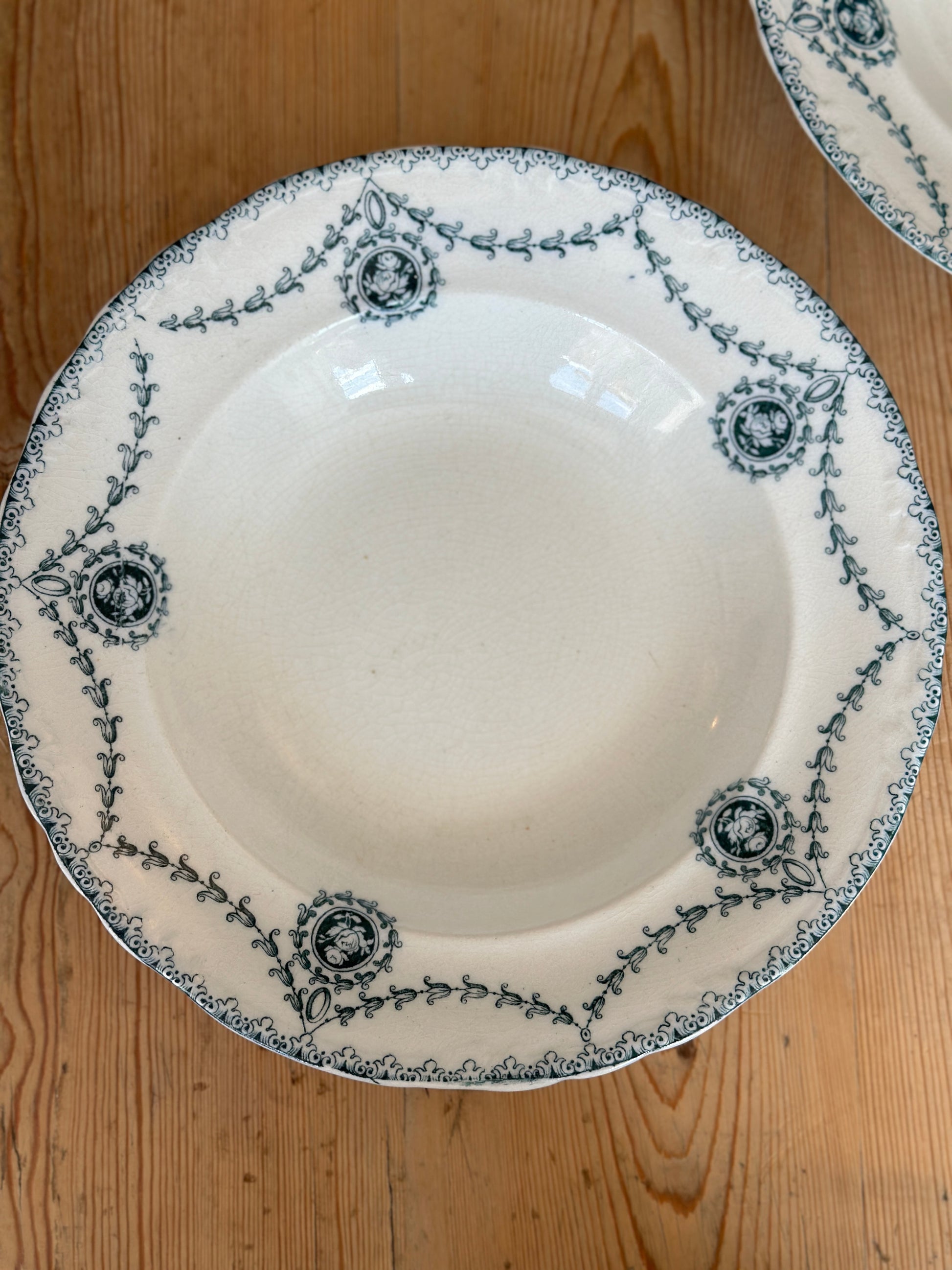 Dybe engelske tallerkner med blå/grøn motiv i kanten