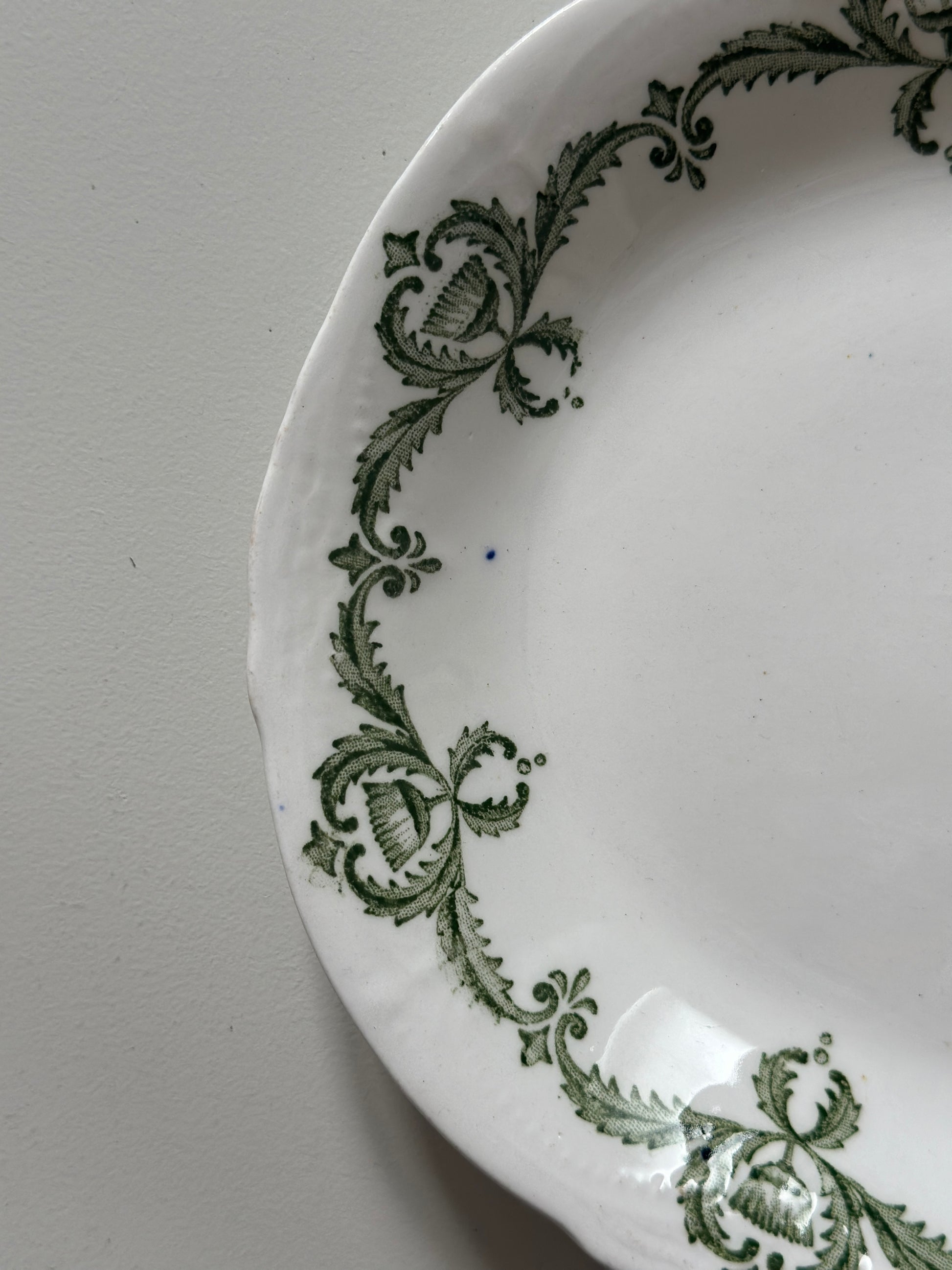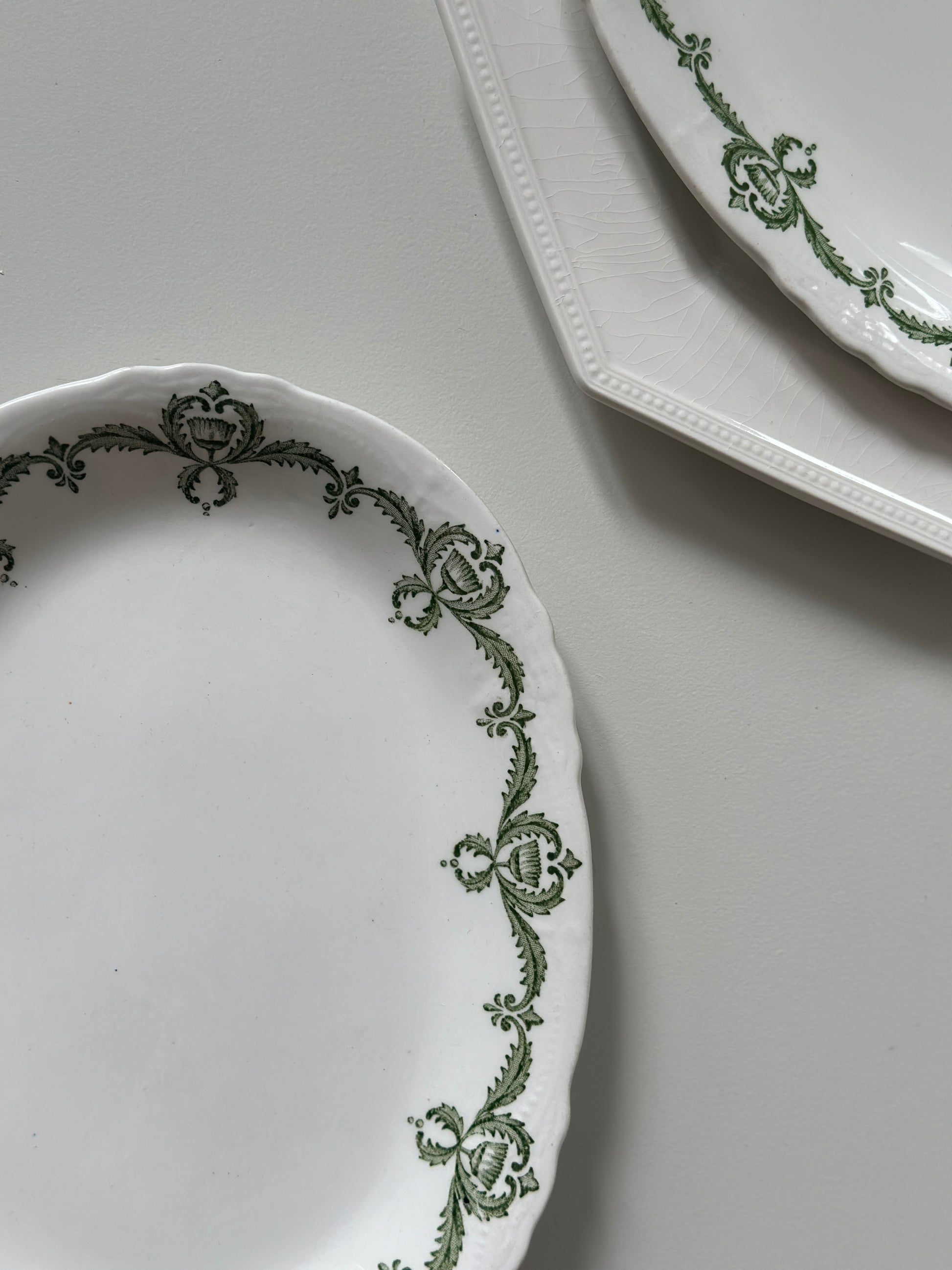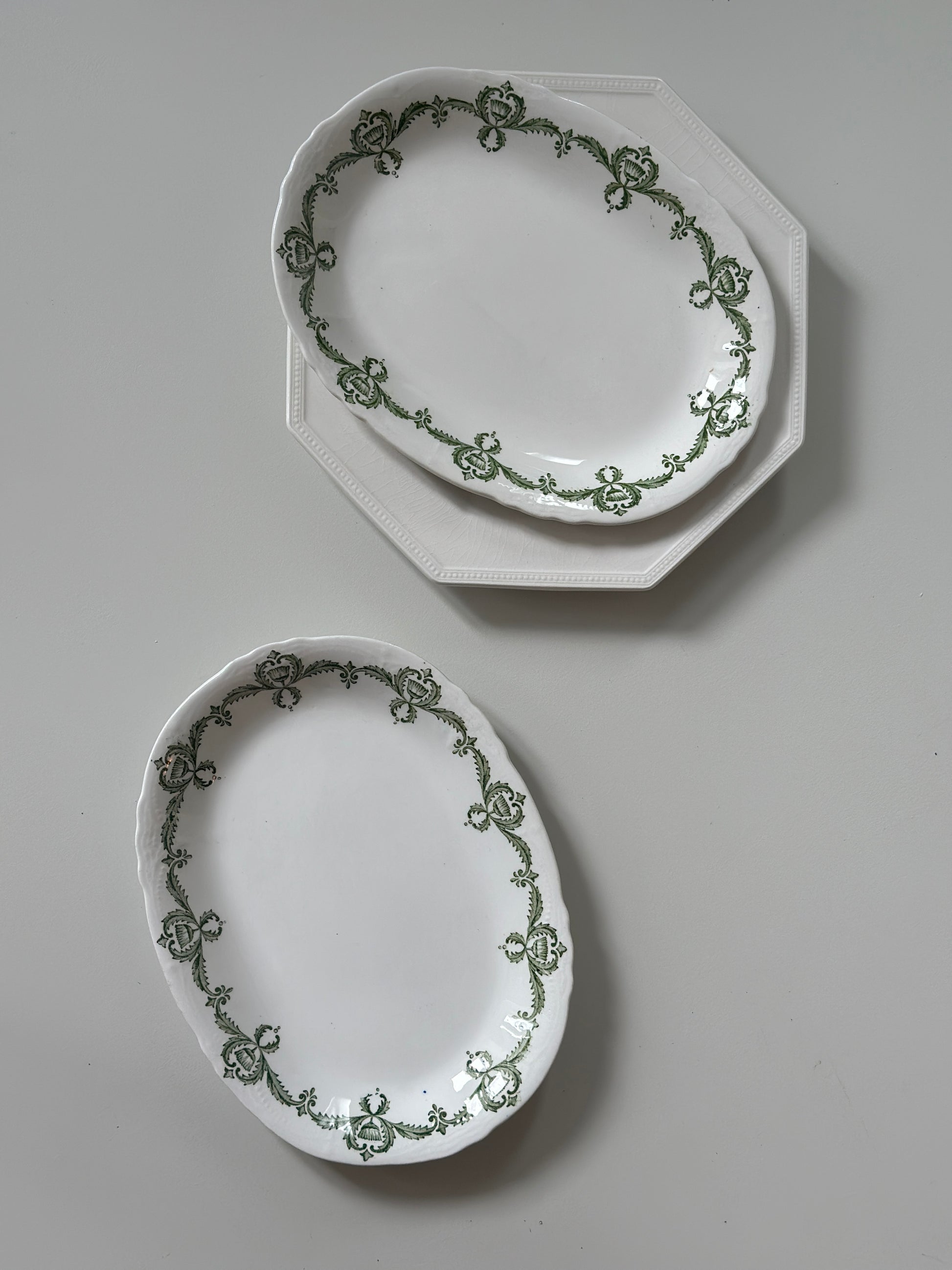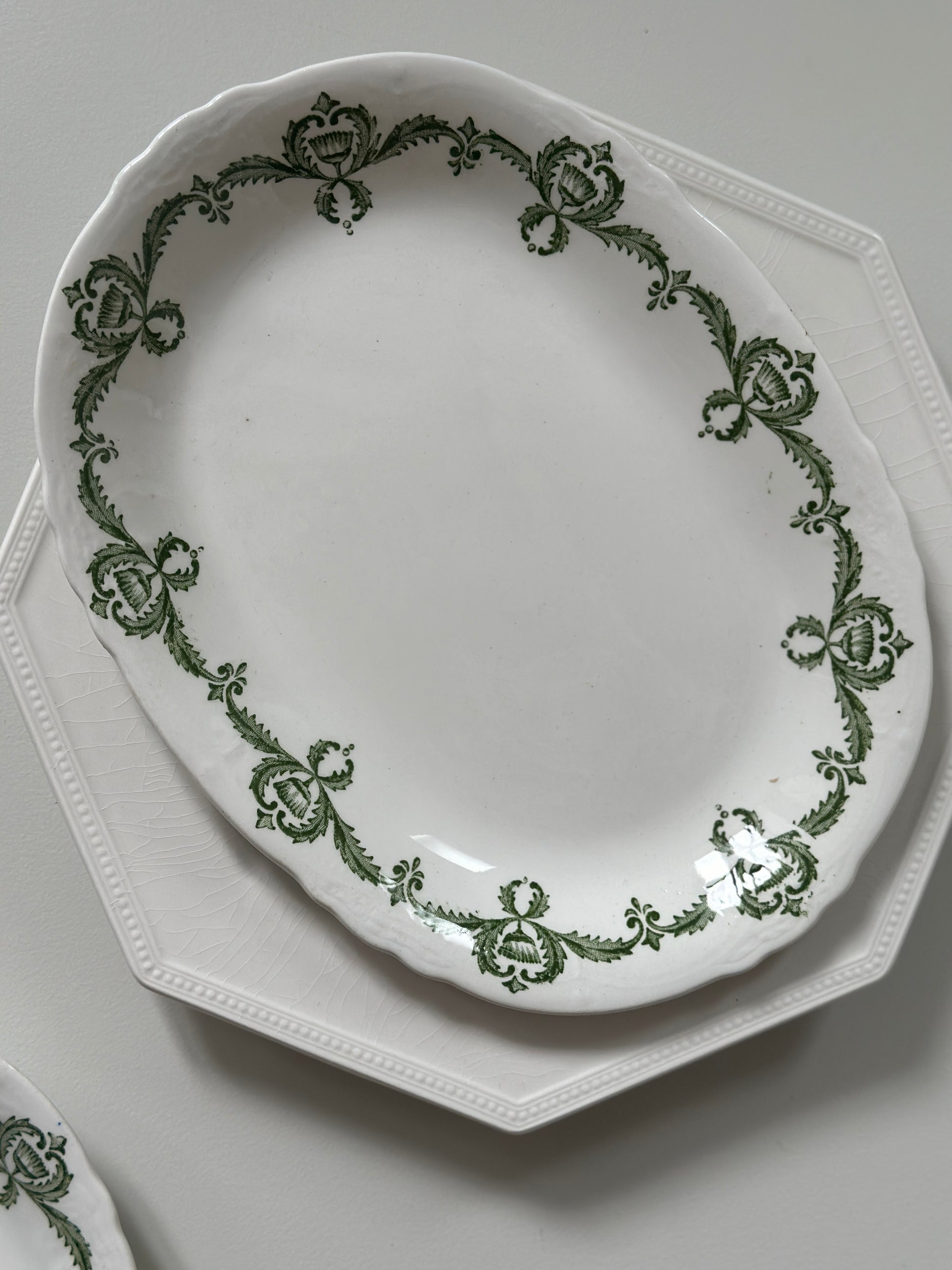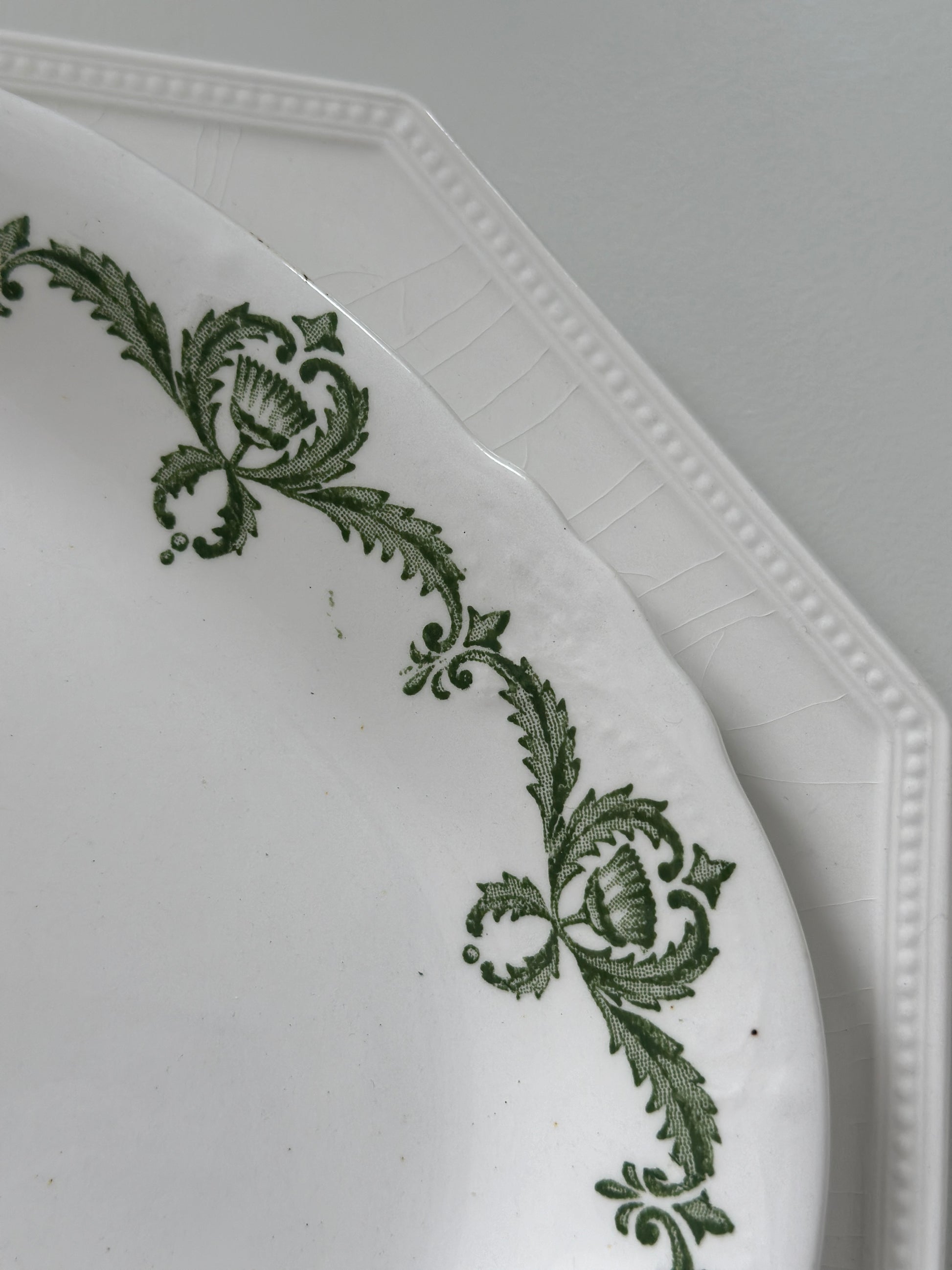 Smukke engelske aflange fade med grønt motiv i kanten