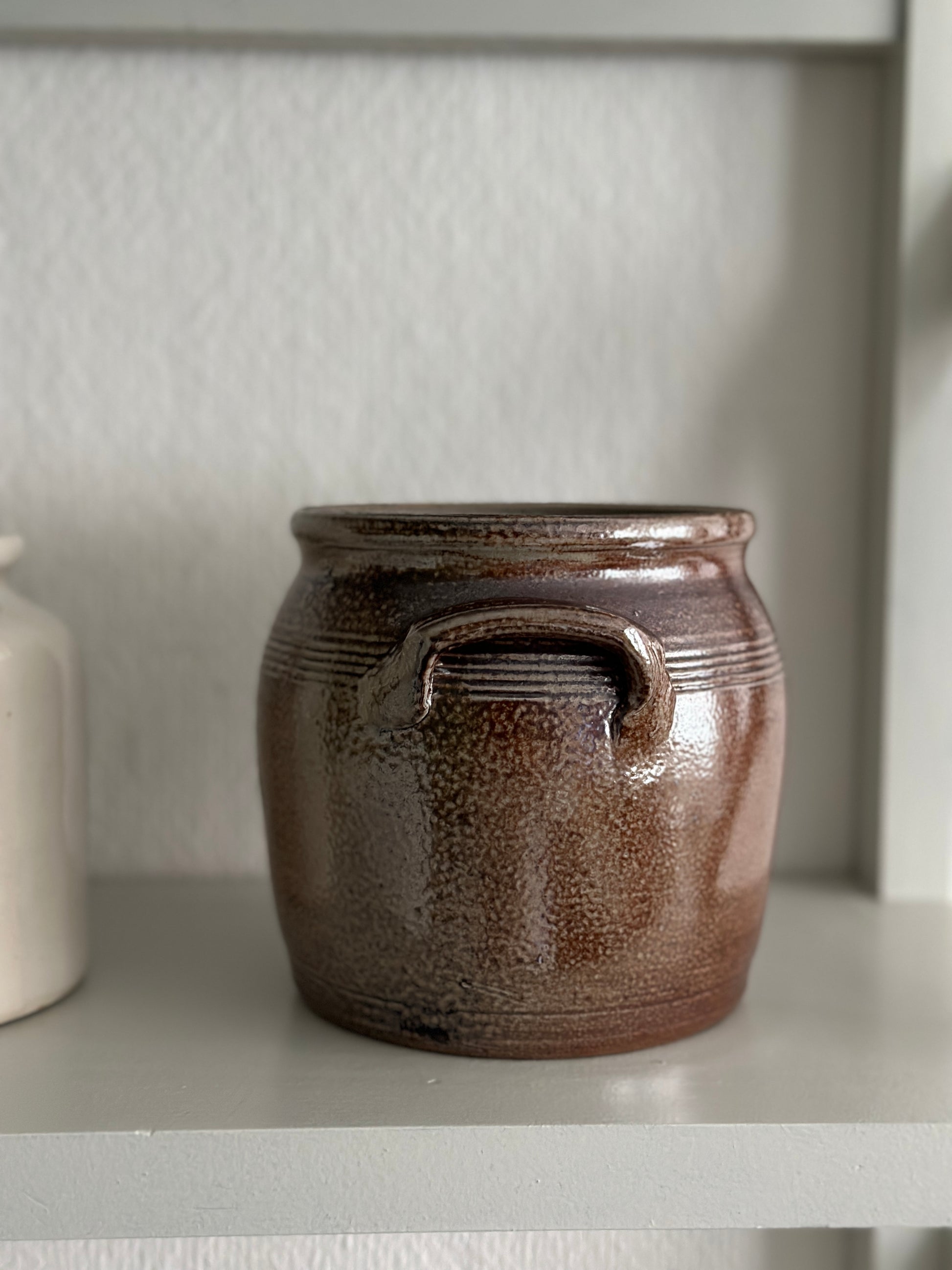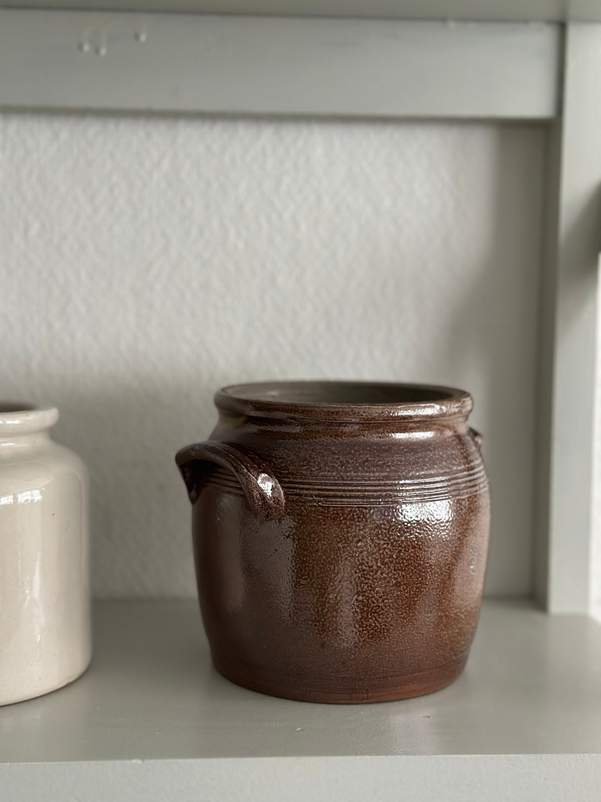 Fransk lille lerkrukke med øre i smuk mørk stentøj. Kan indeholde 1 liter