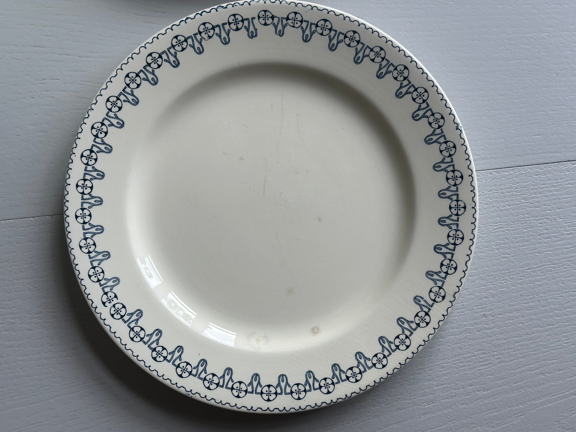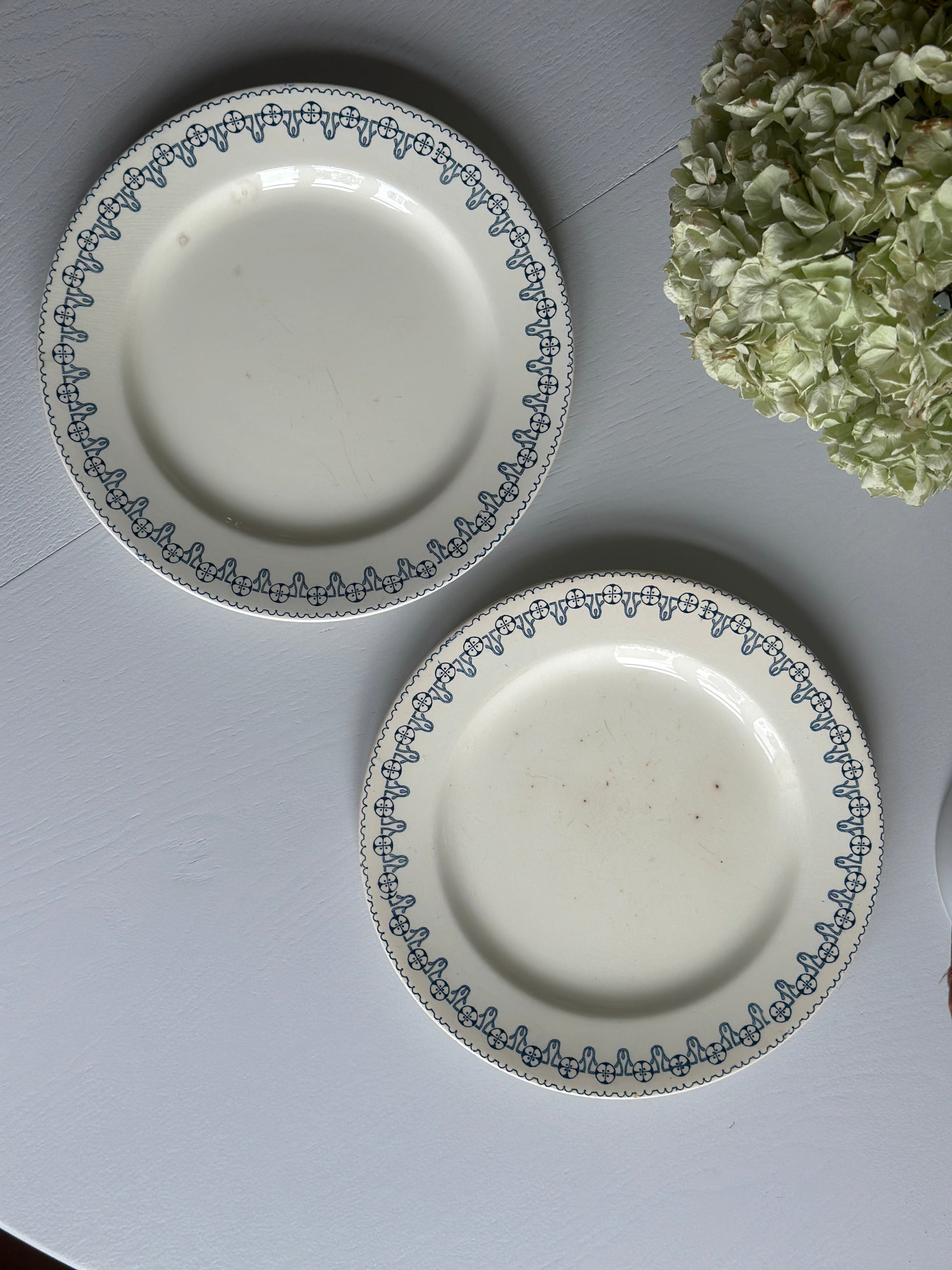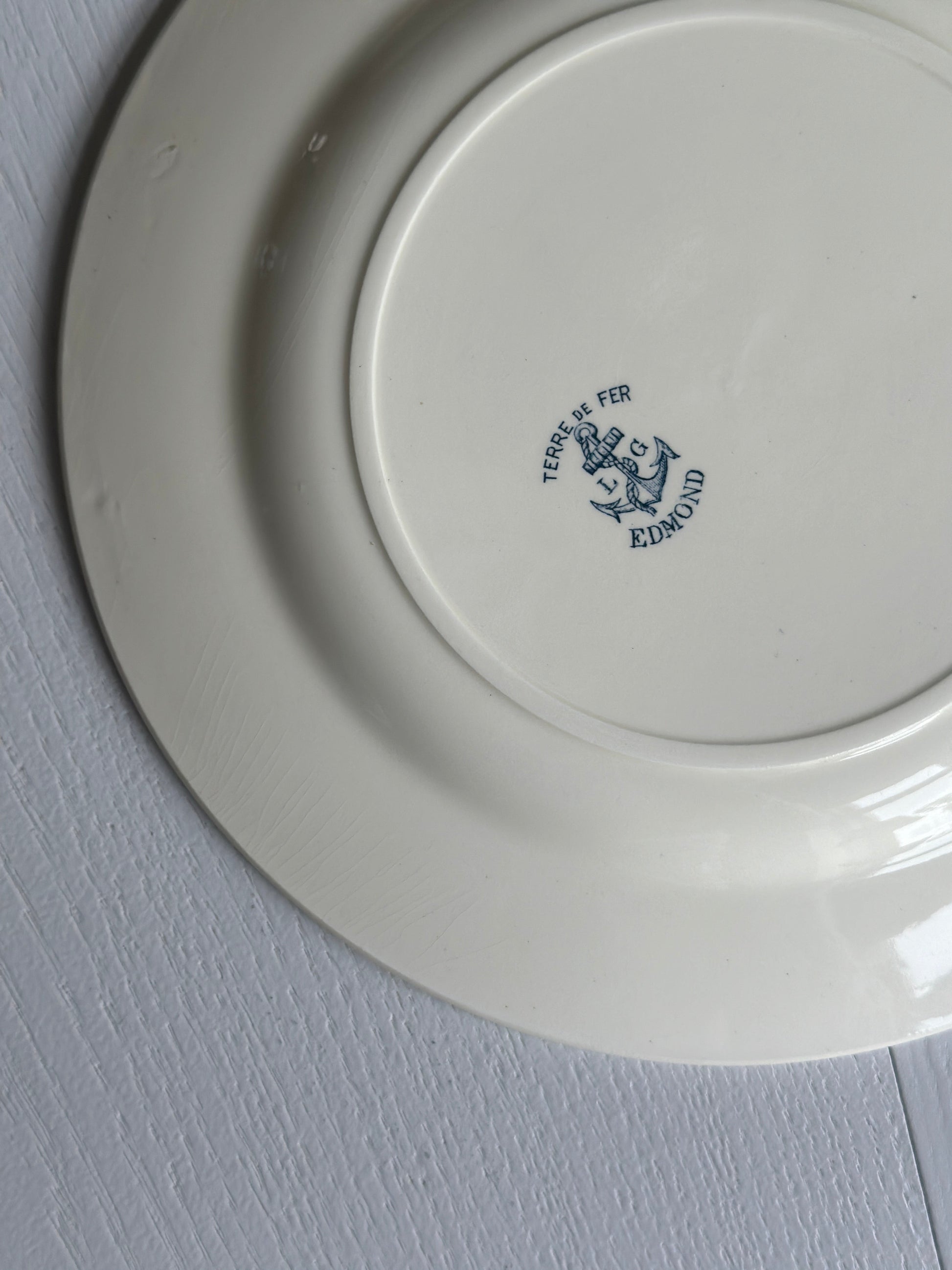 Franske spisetallerkner i creme med blå motiv i kanten. Stempet Terre De Fer Edmond