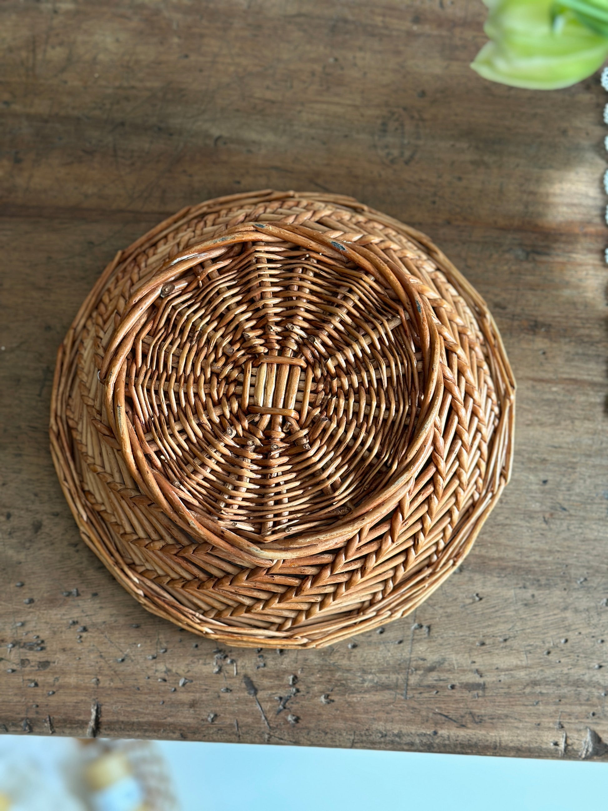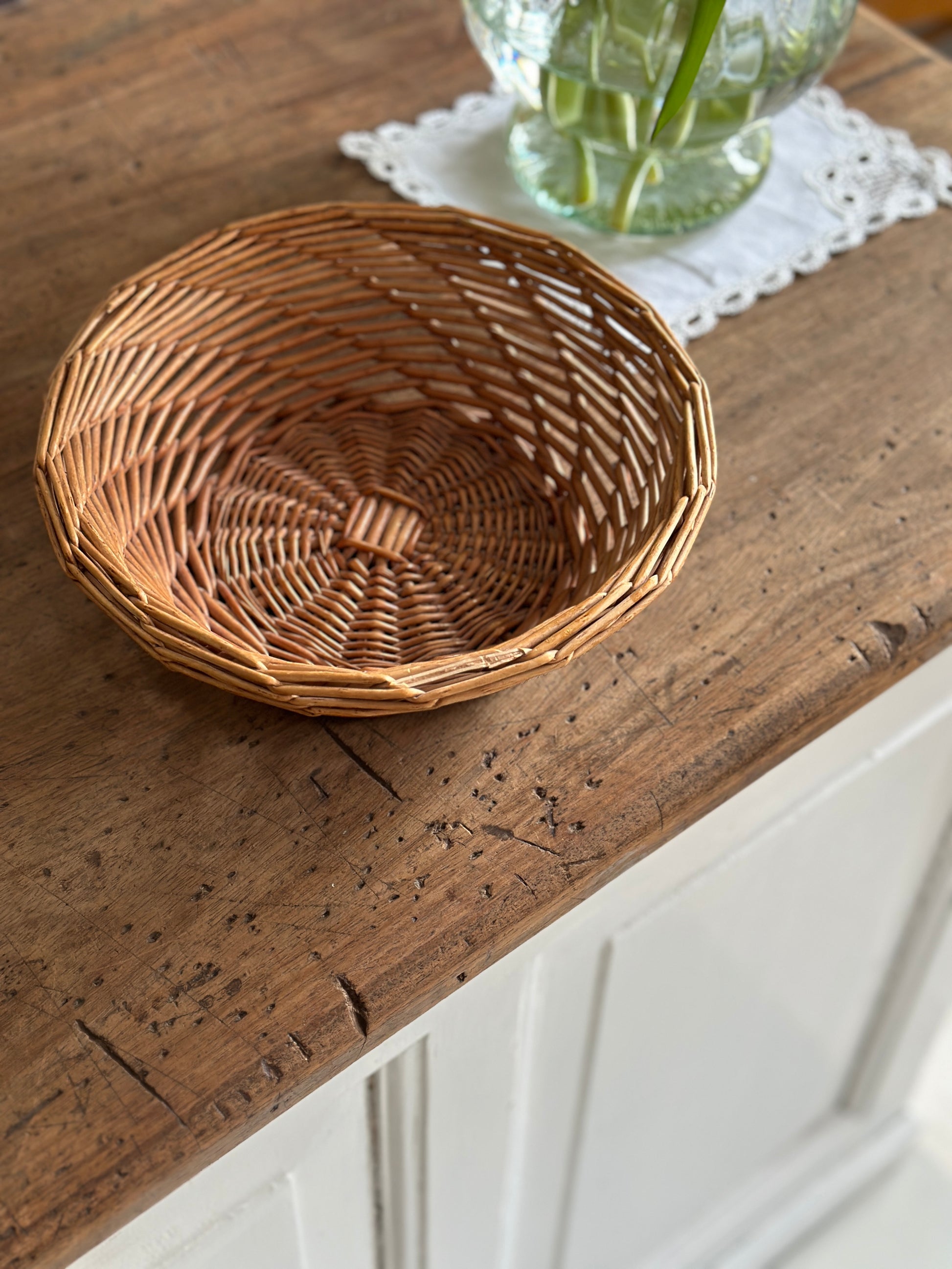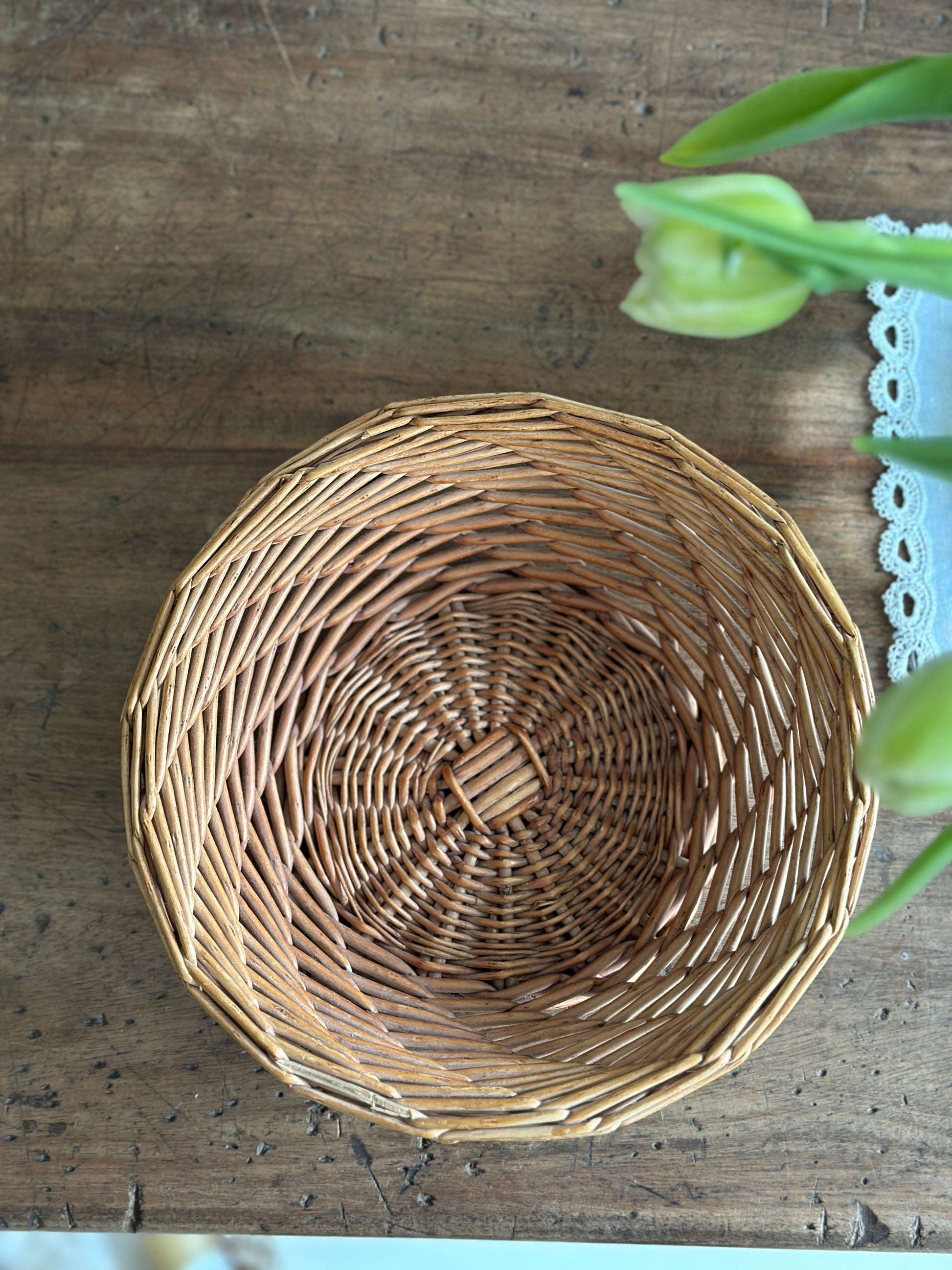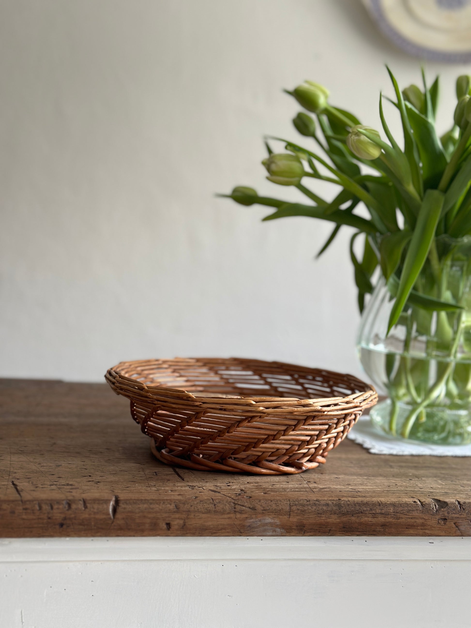 Fin flettet rund brødkurv med mønster