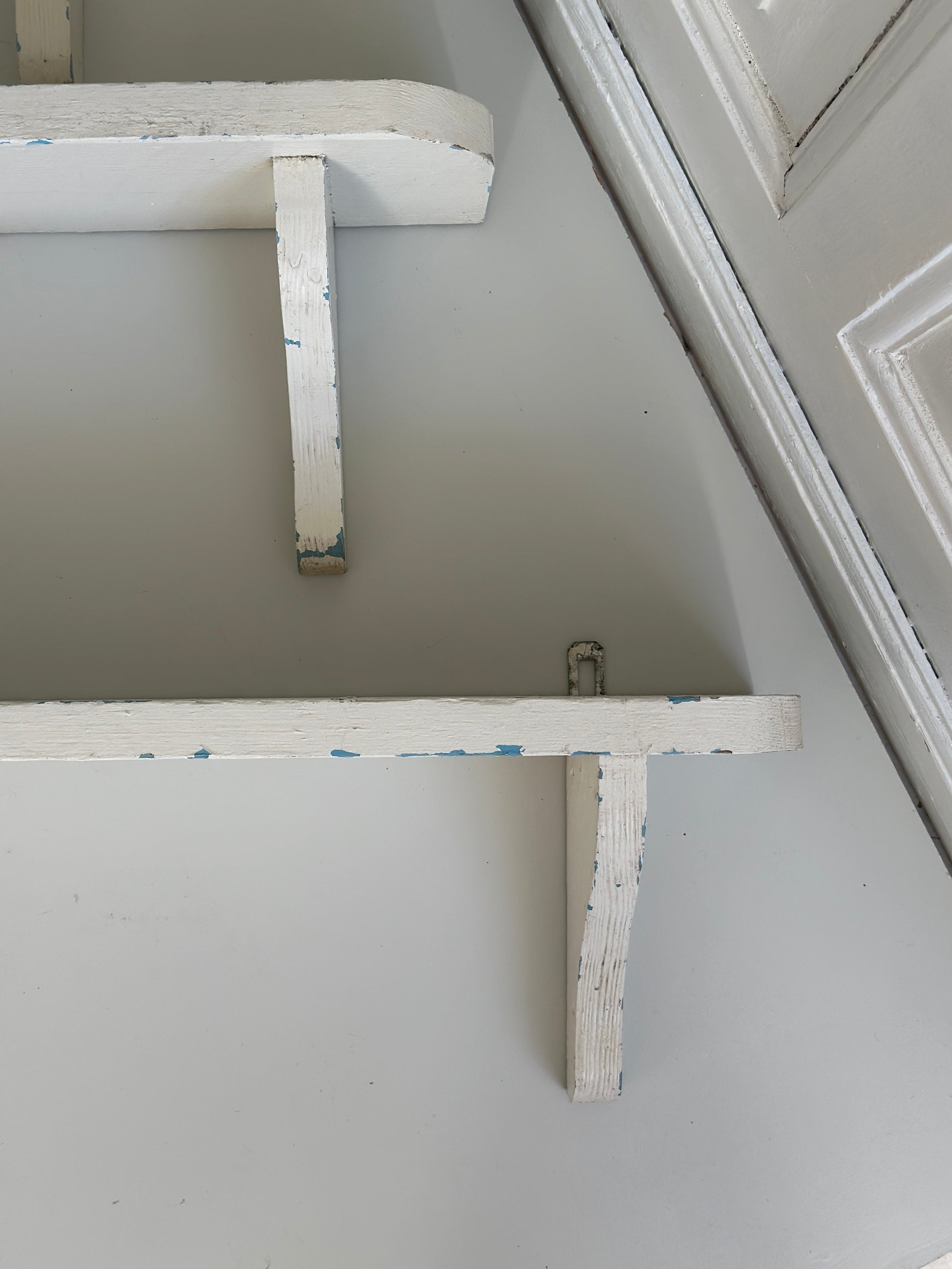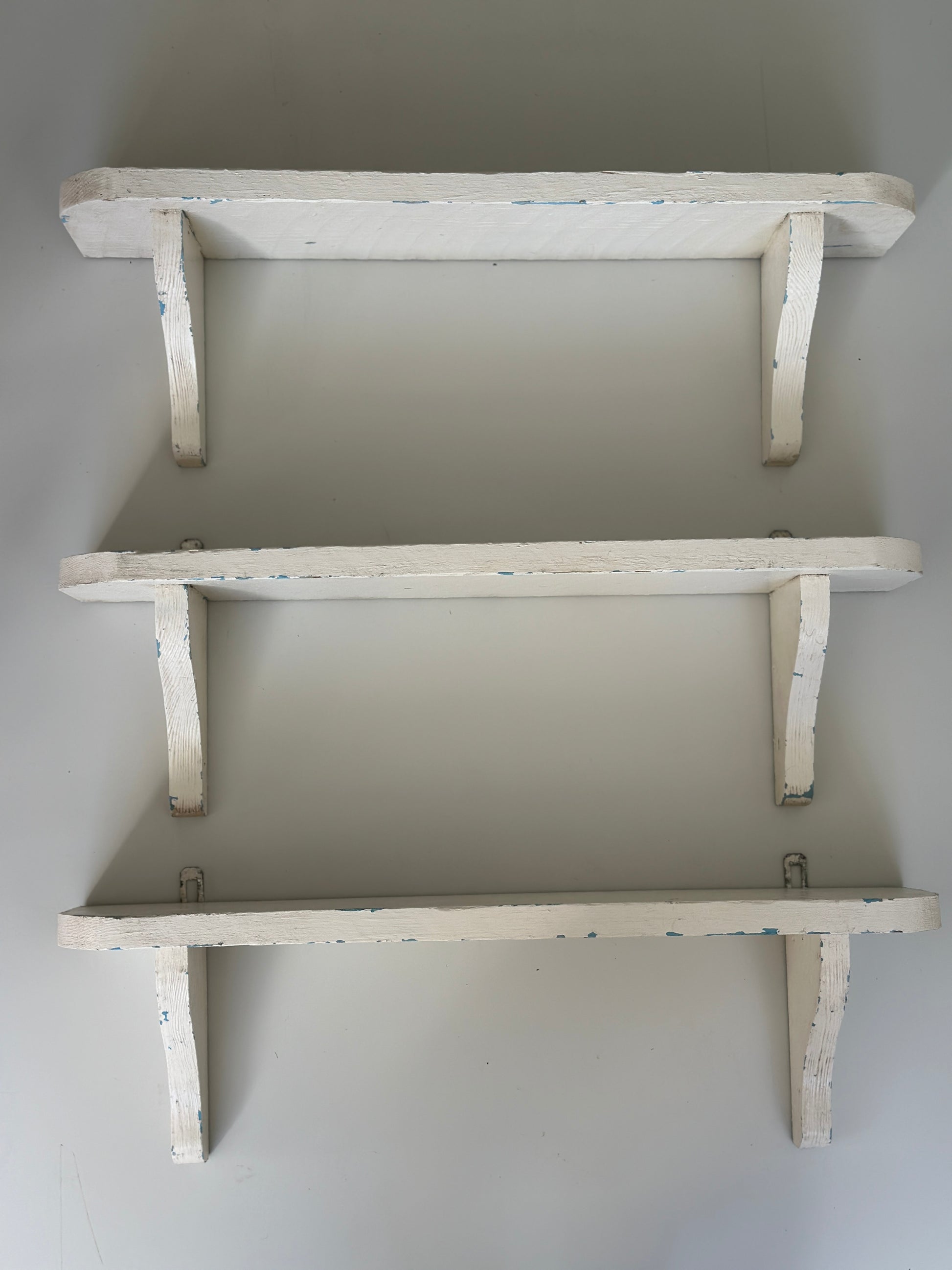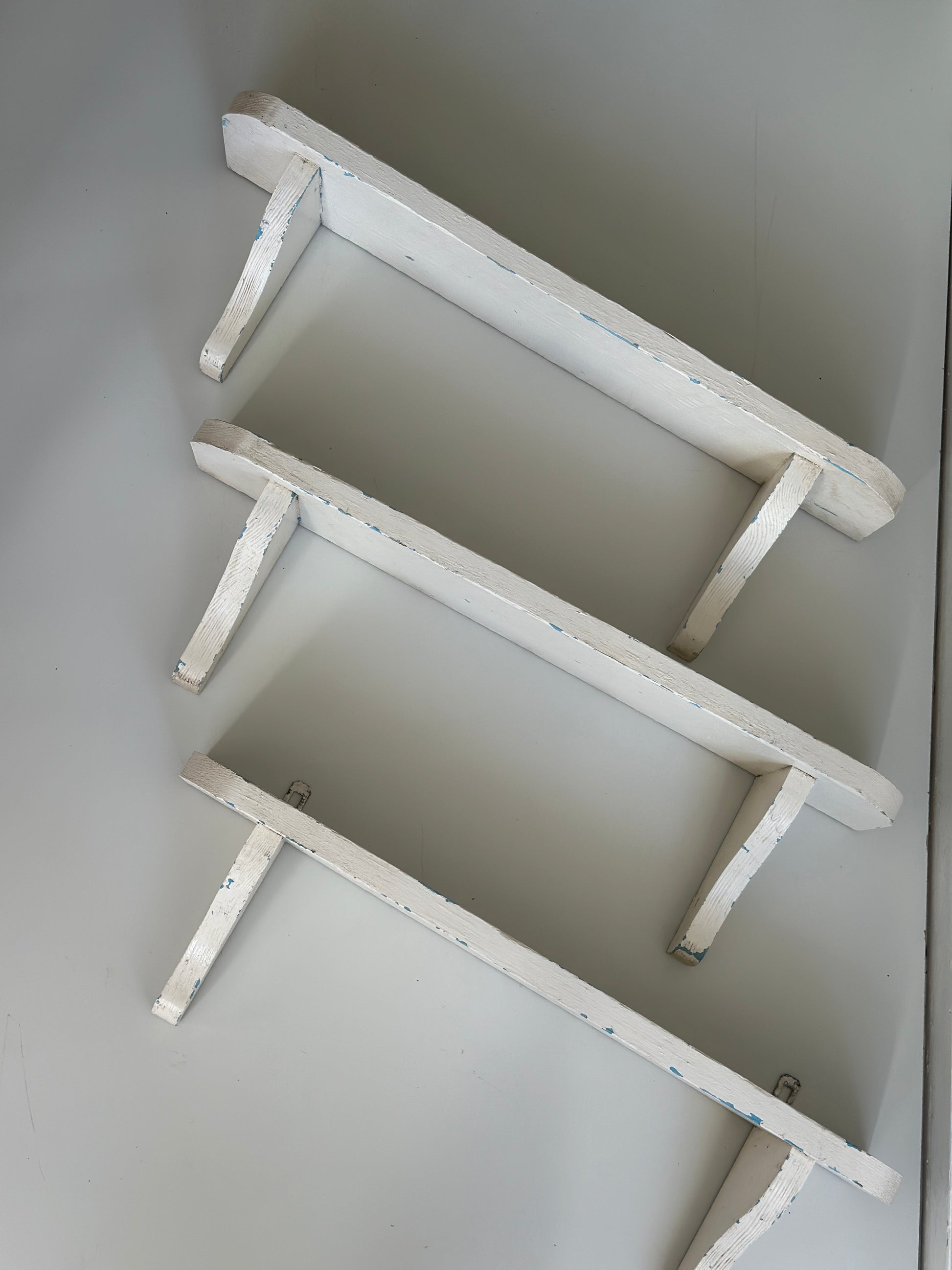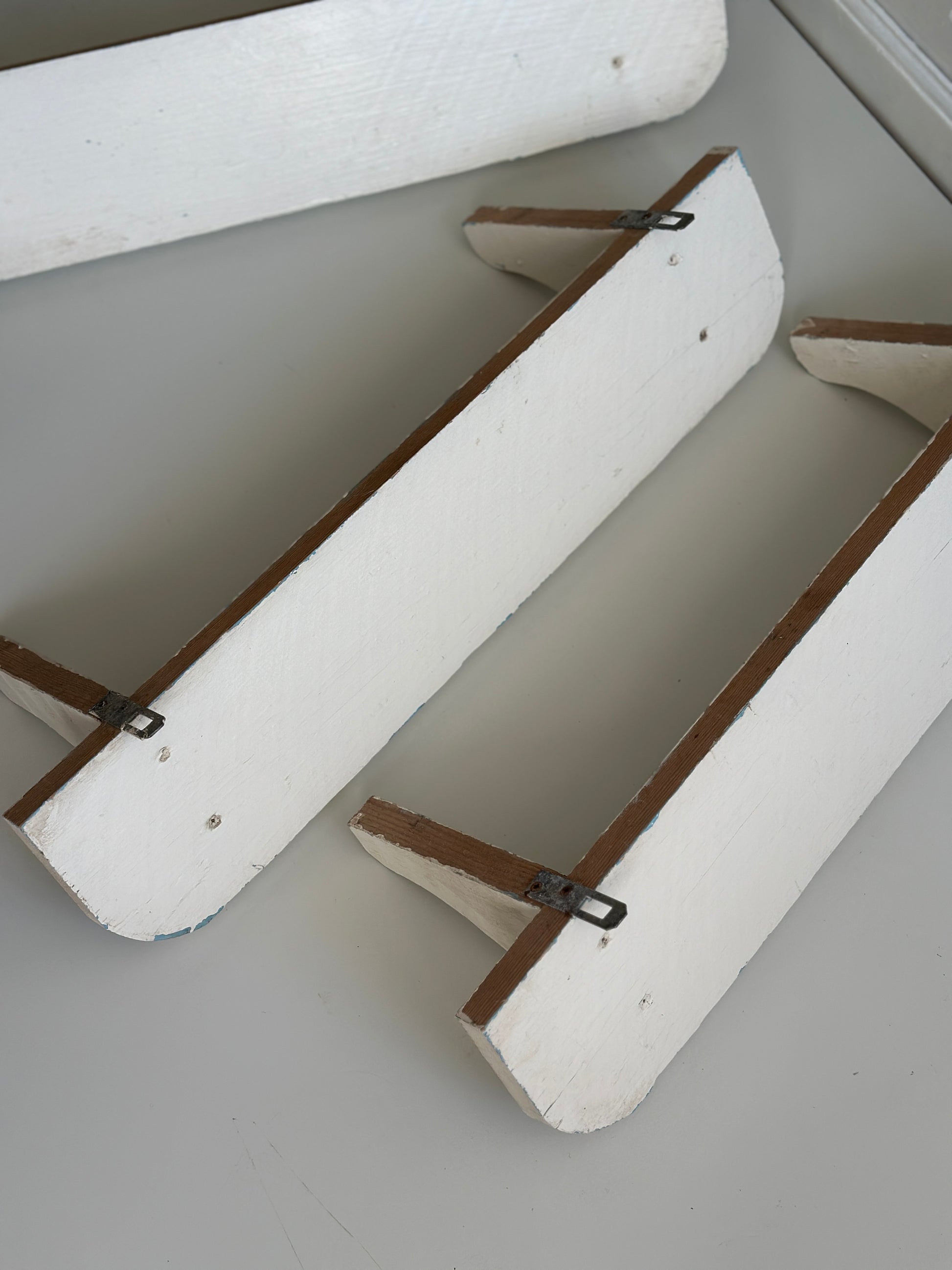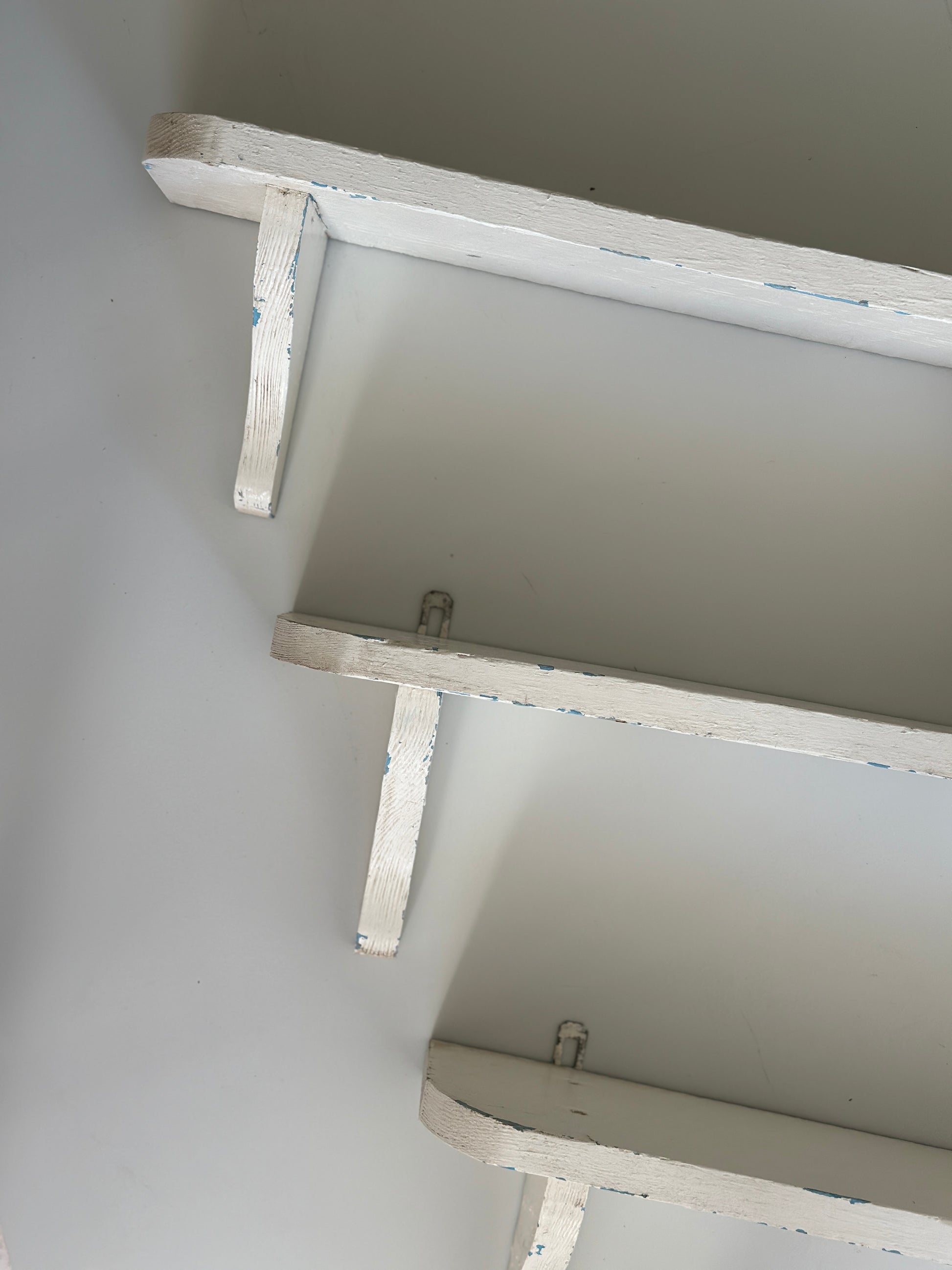 Hylder i træ med hyldeknægte. De er hvidmalet og har lækker patina