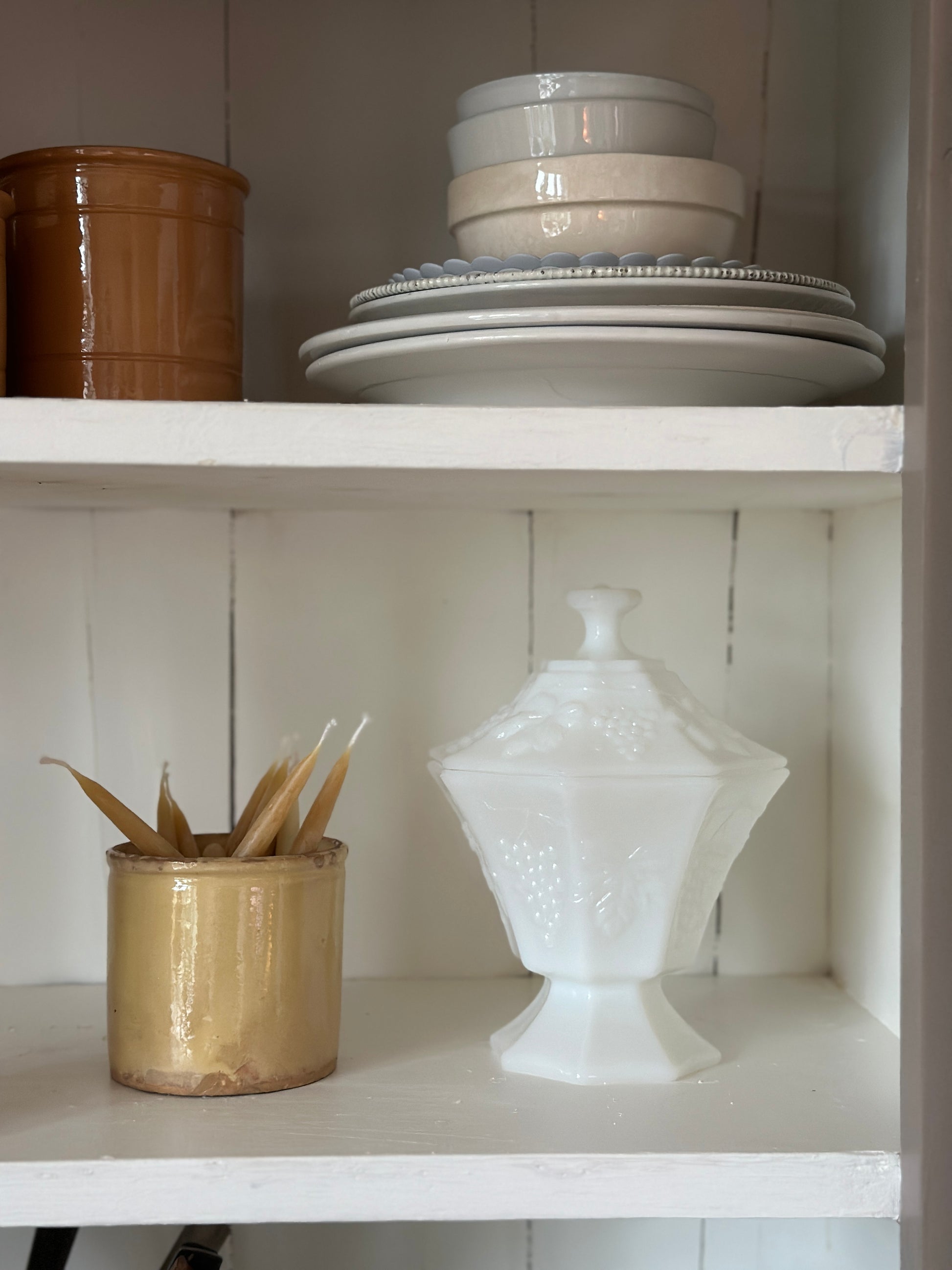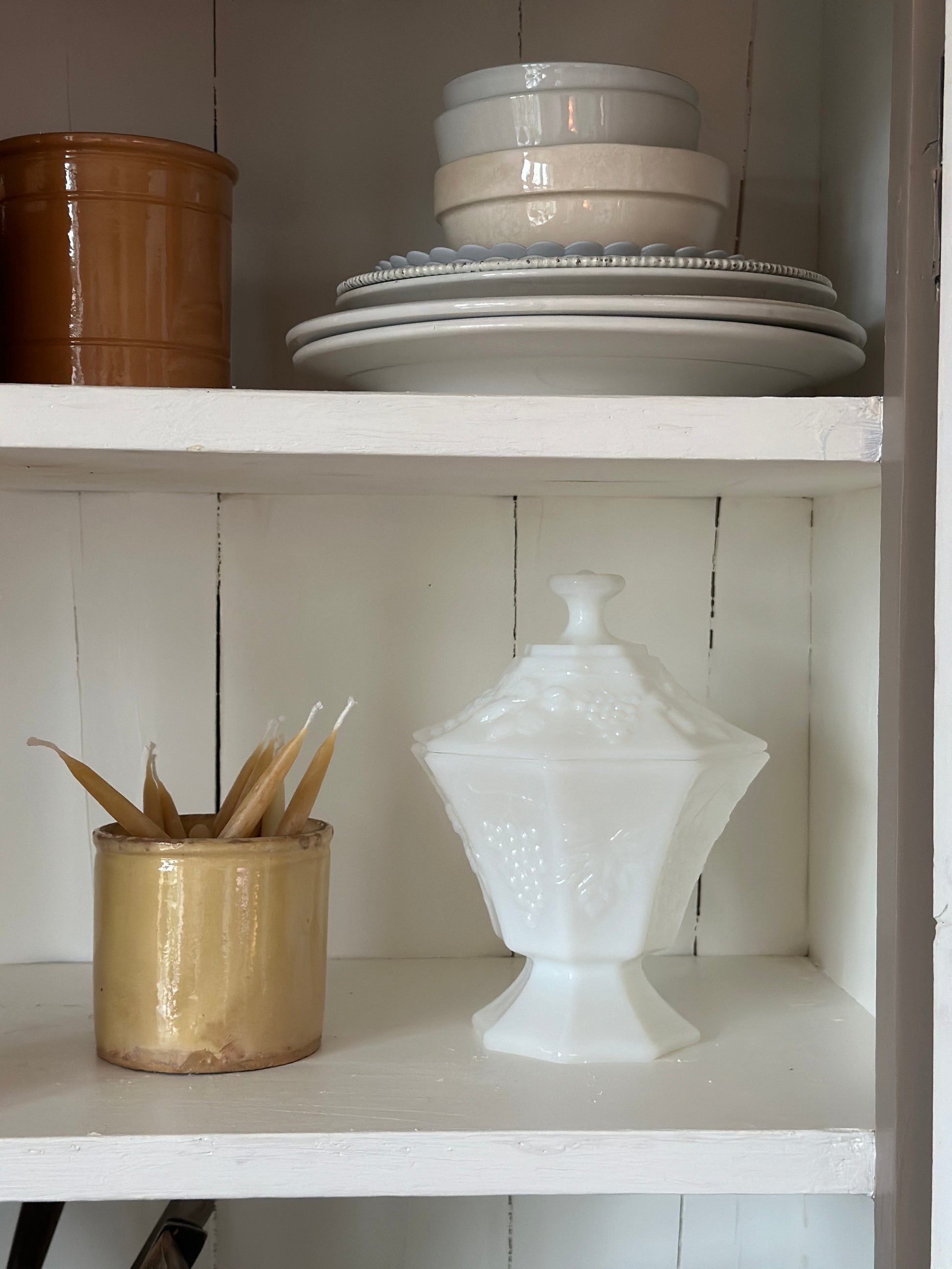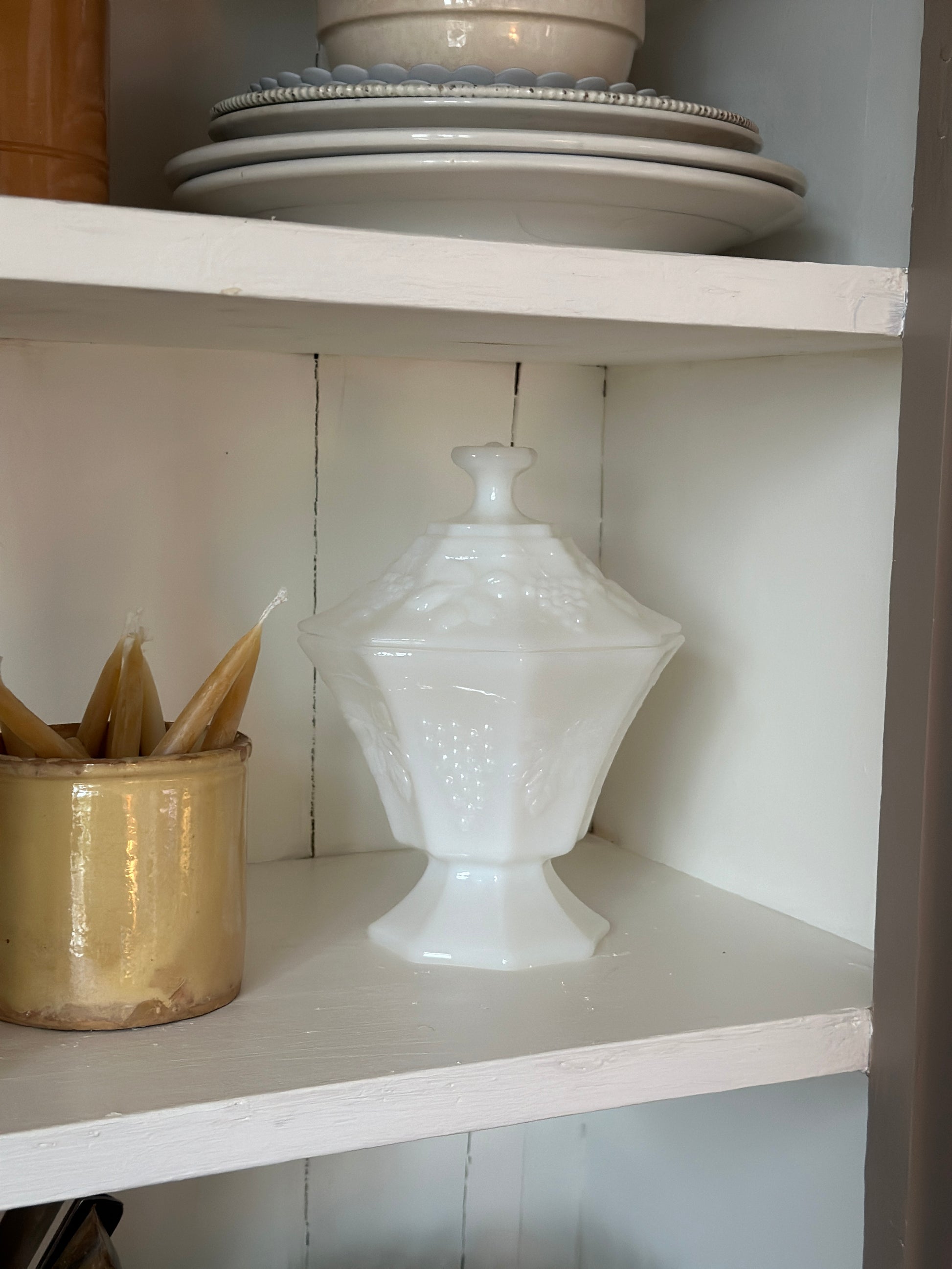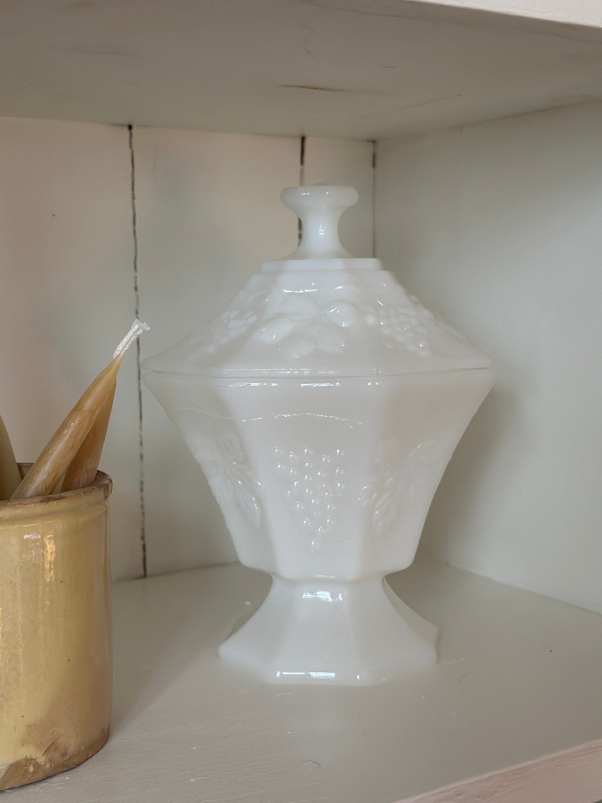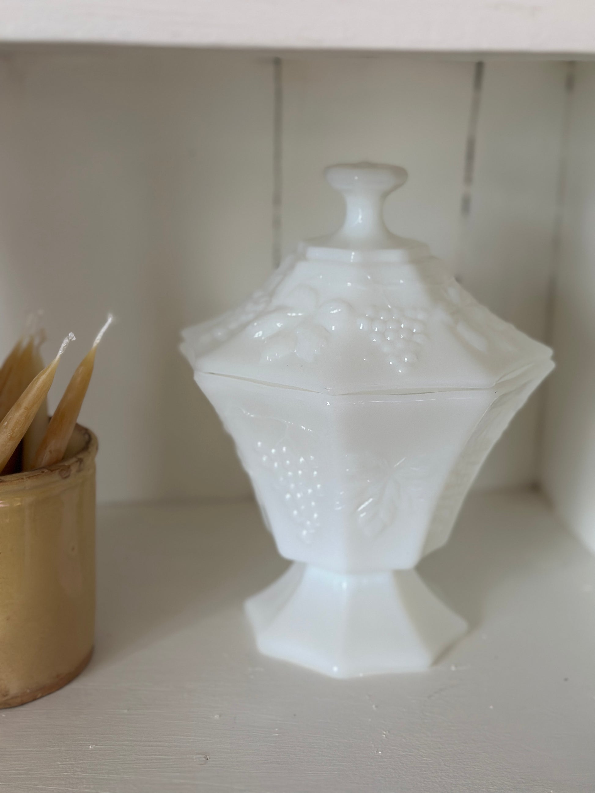Smukkeste kantet bonbonniere i hvid opaline med drue motiv