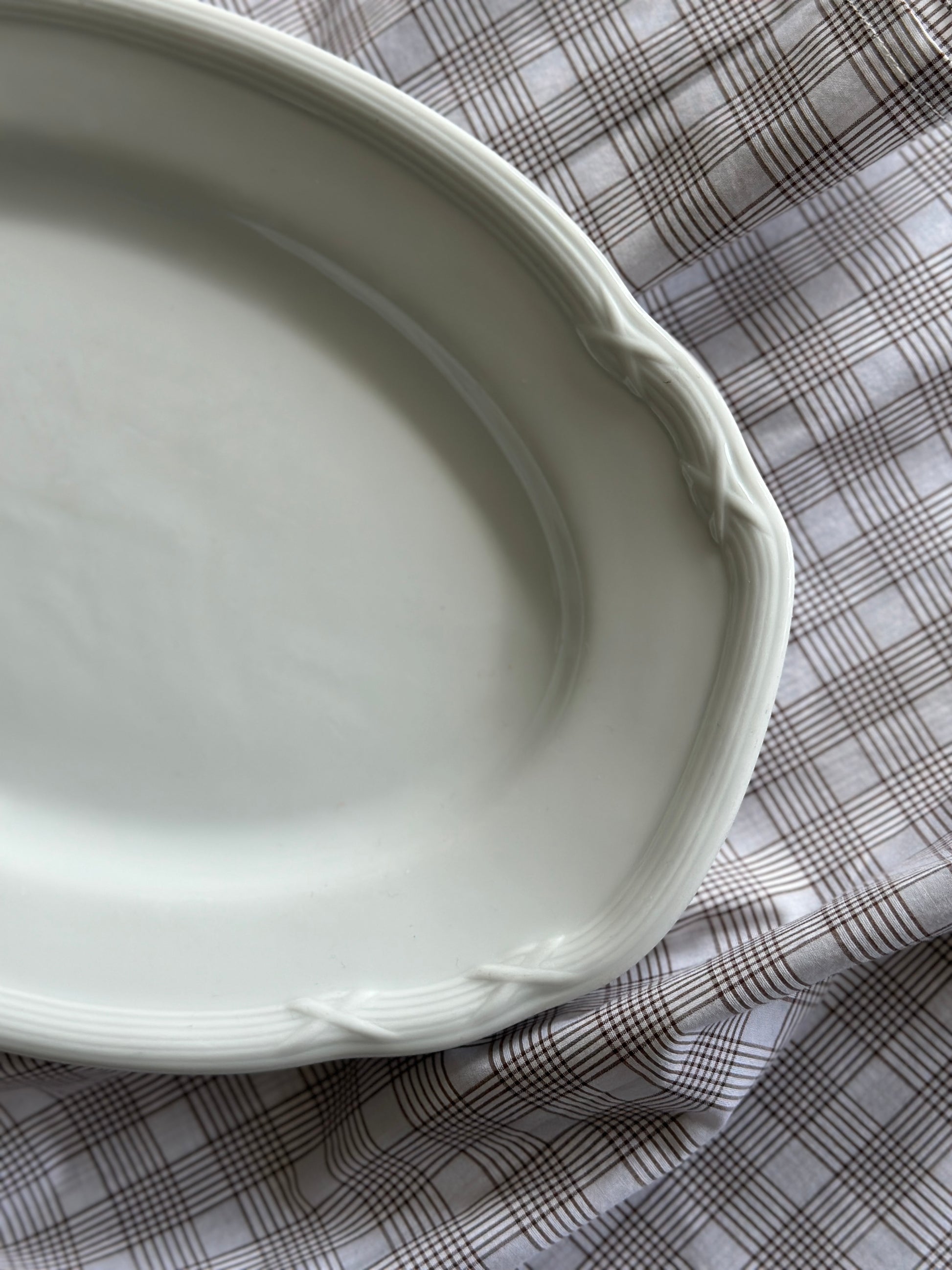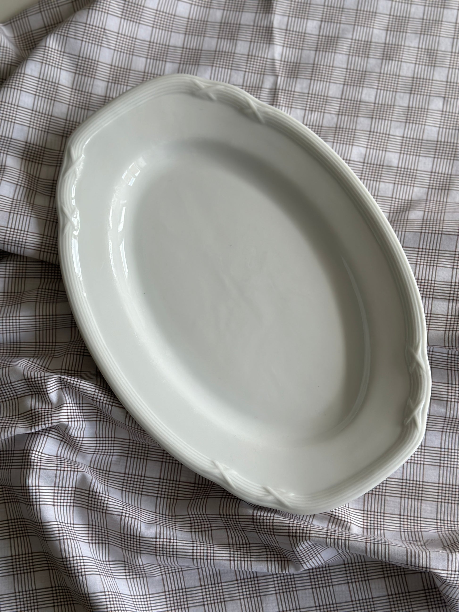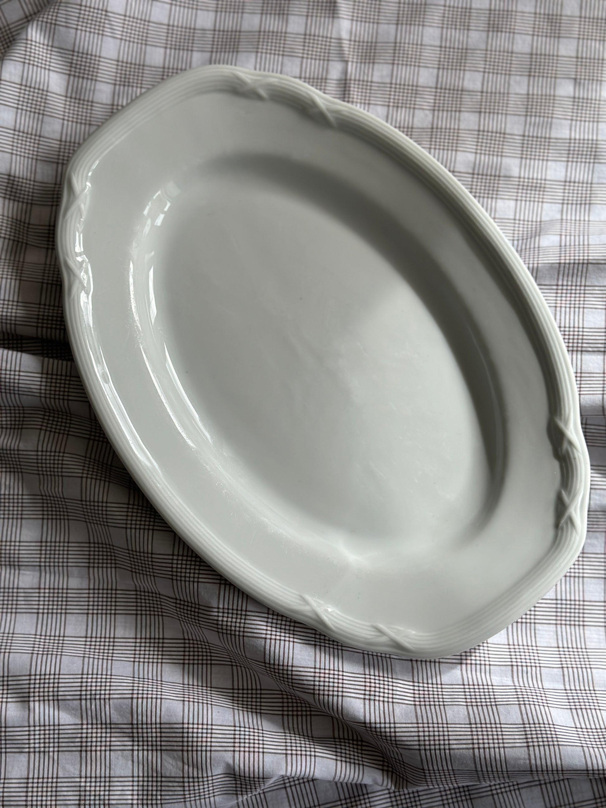 Smukt hvidt fad med fineste mønster i kanten