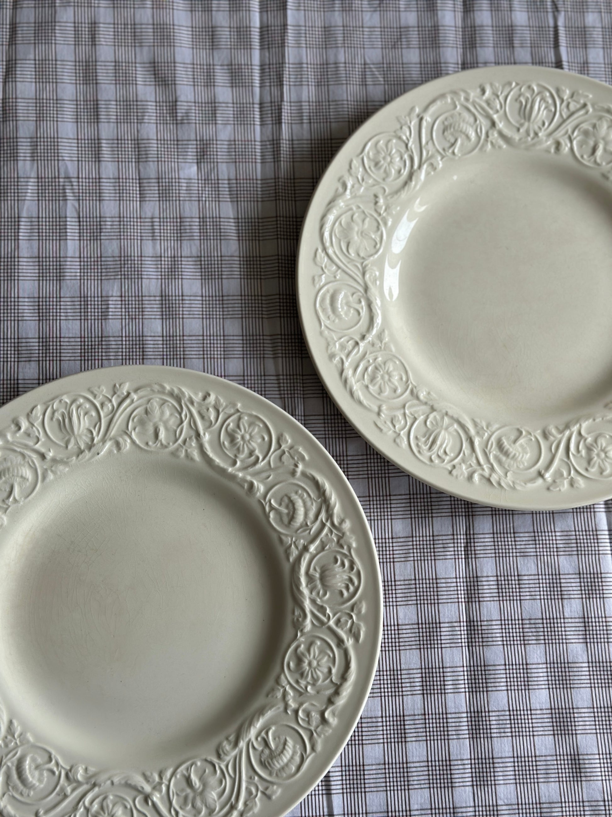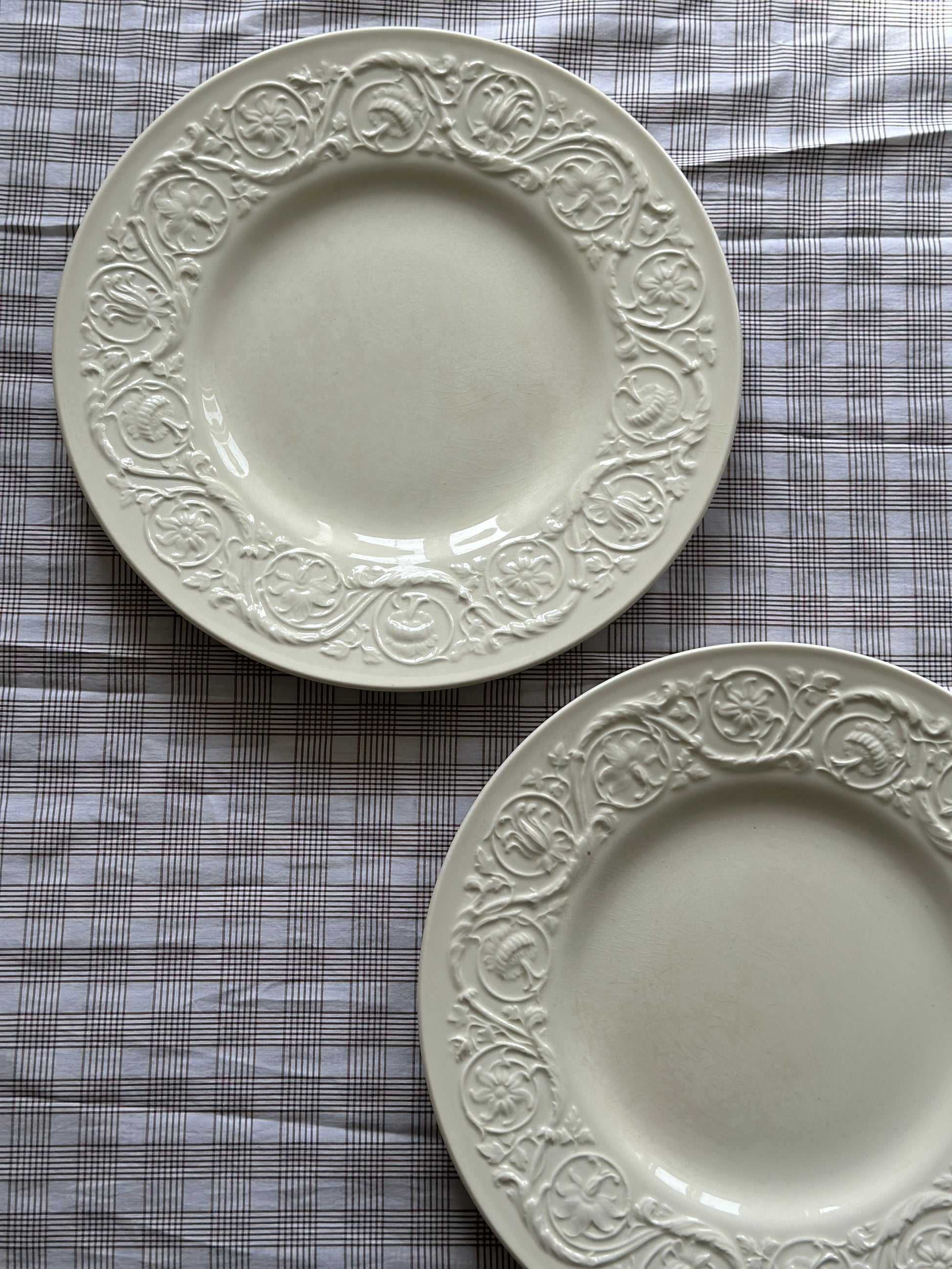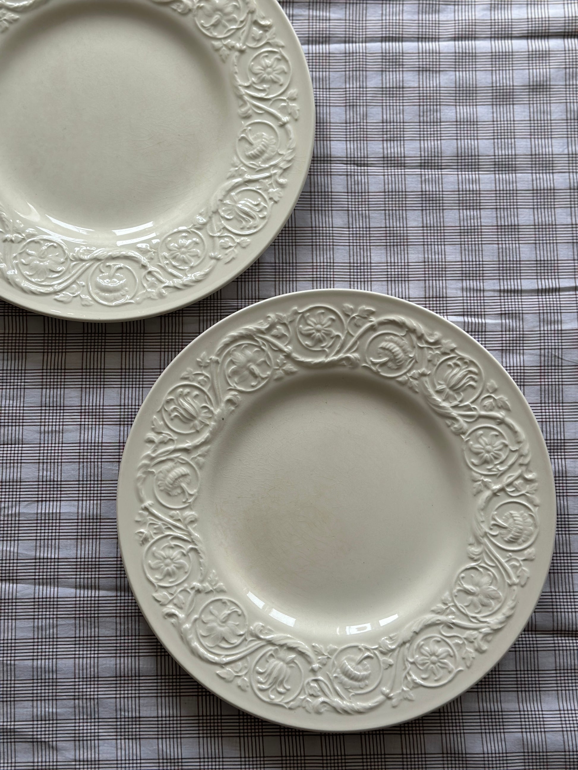 Store smukke cremefarvet spisetallerkner med blomstermotiv i kanten fra England.