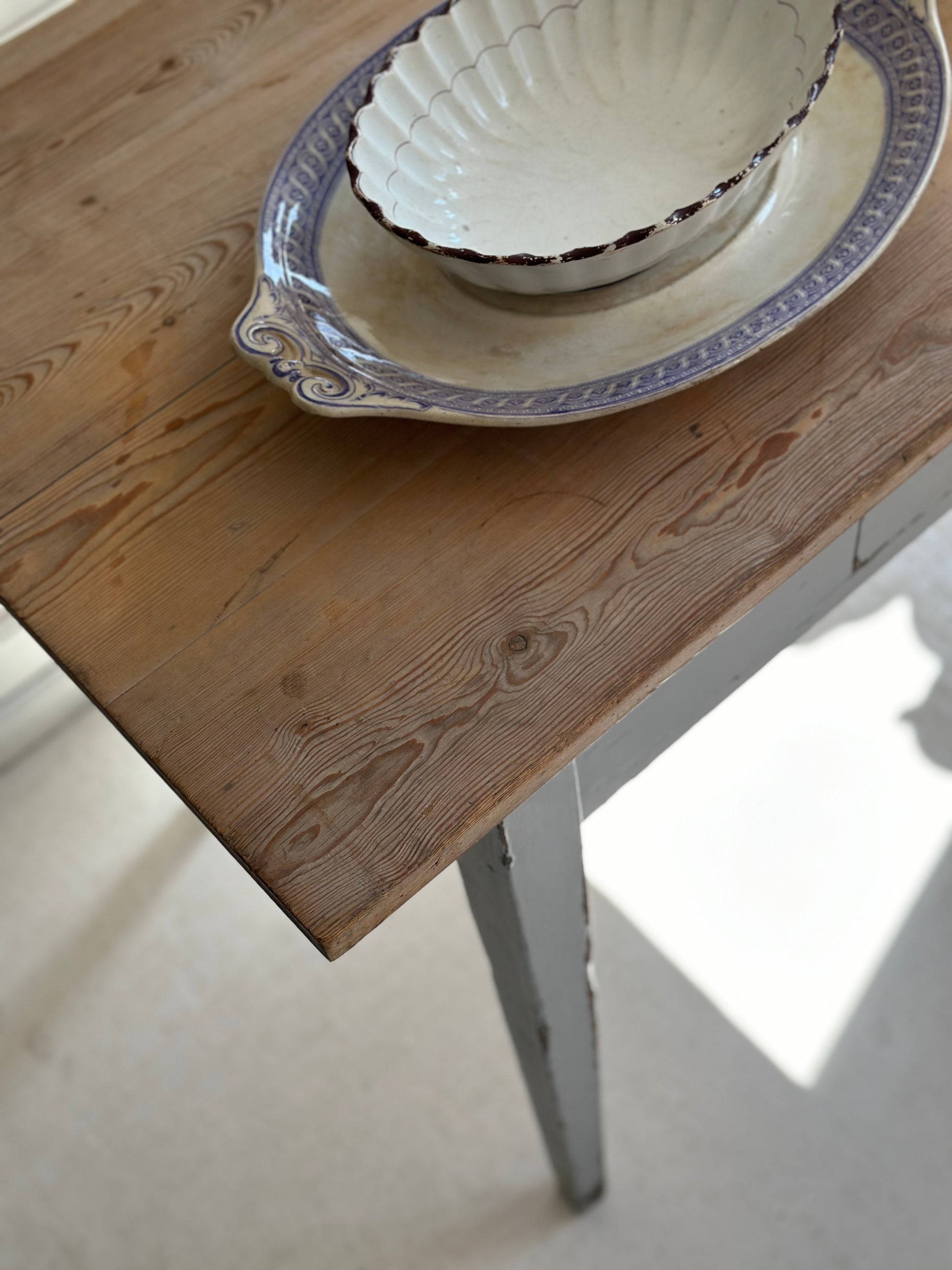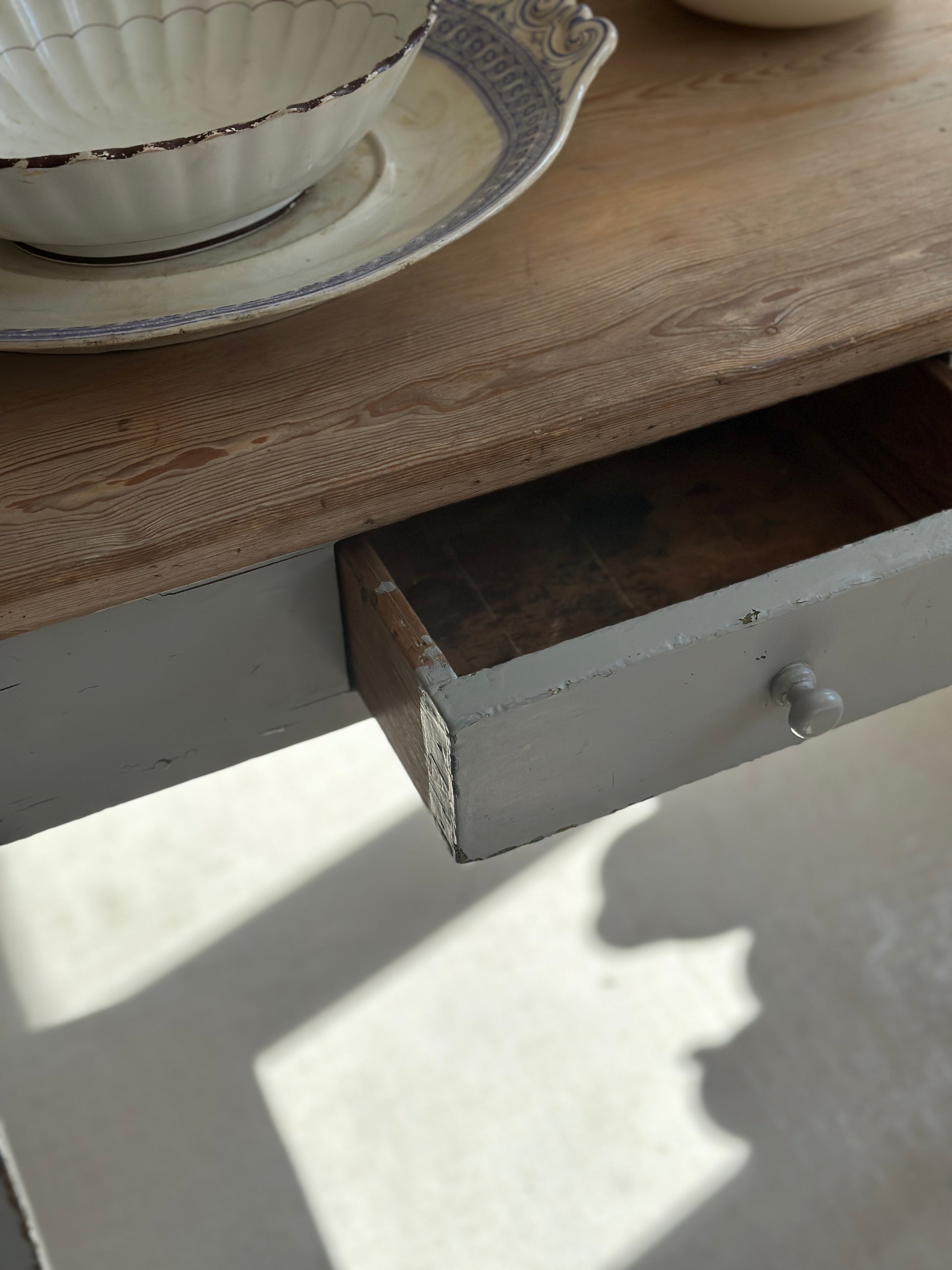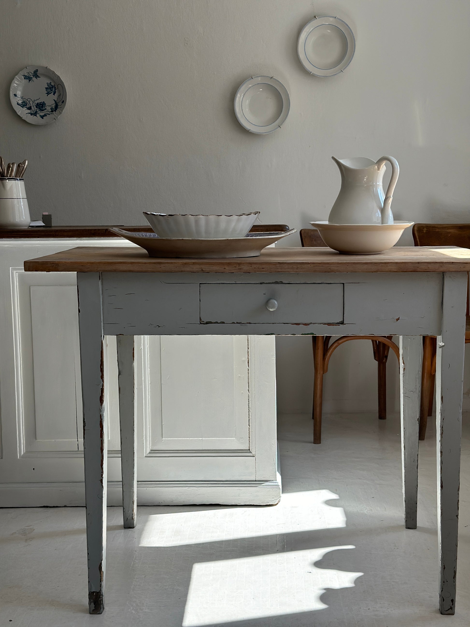 Fineste svenske bord med malet ben og rå træplade samt en skuffe