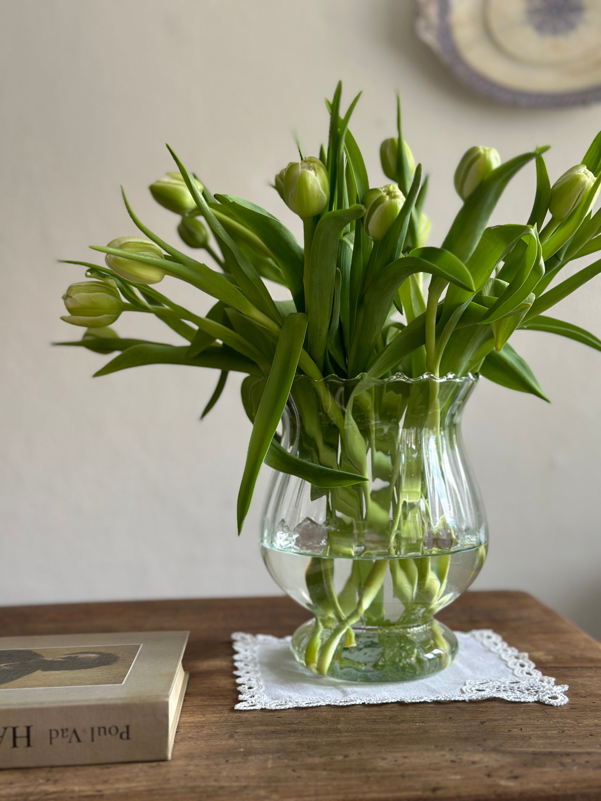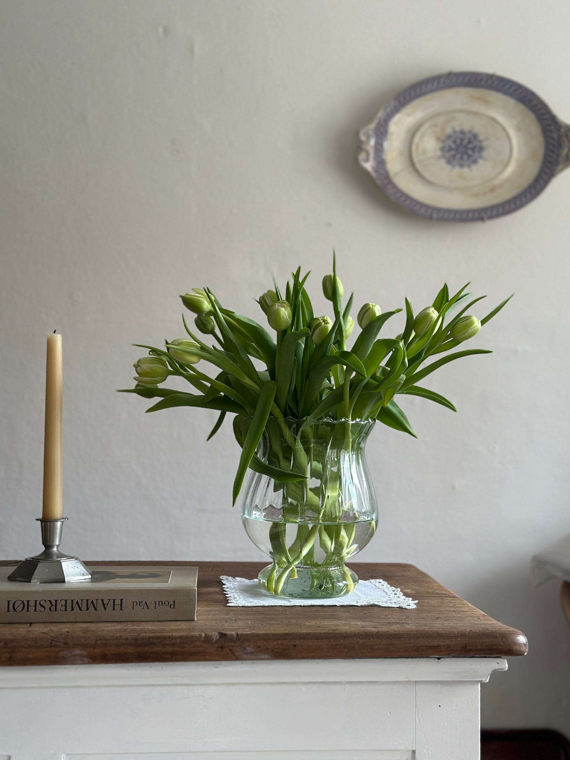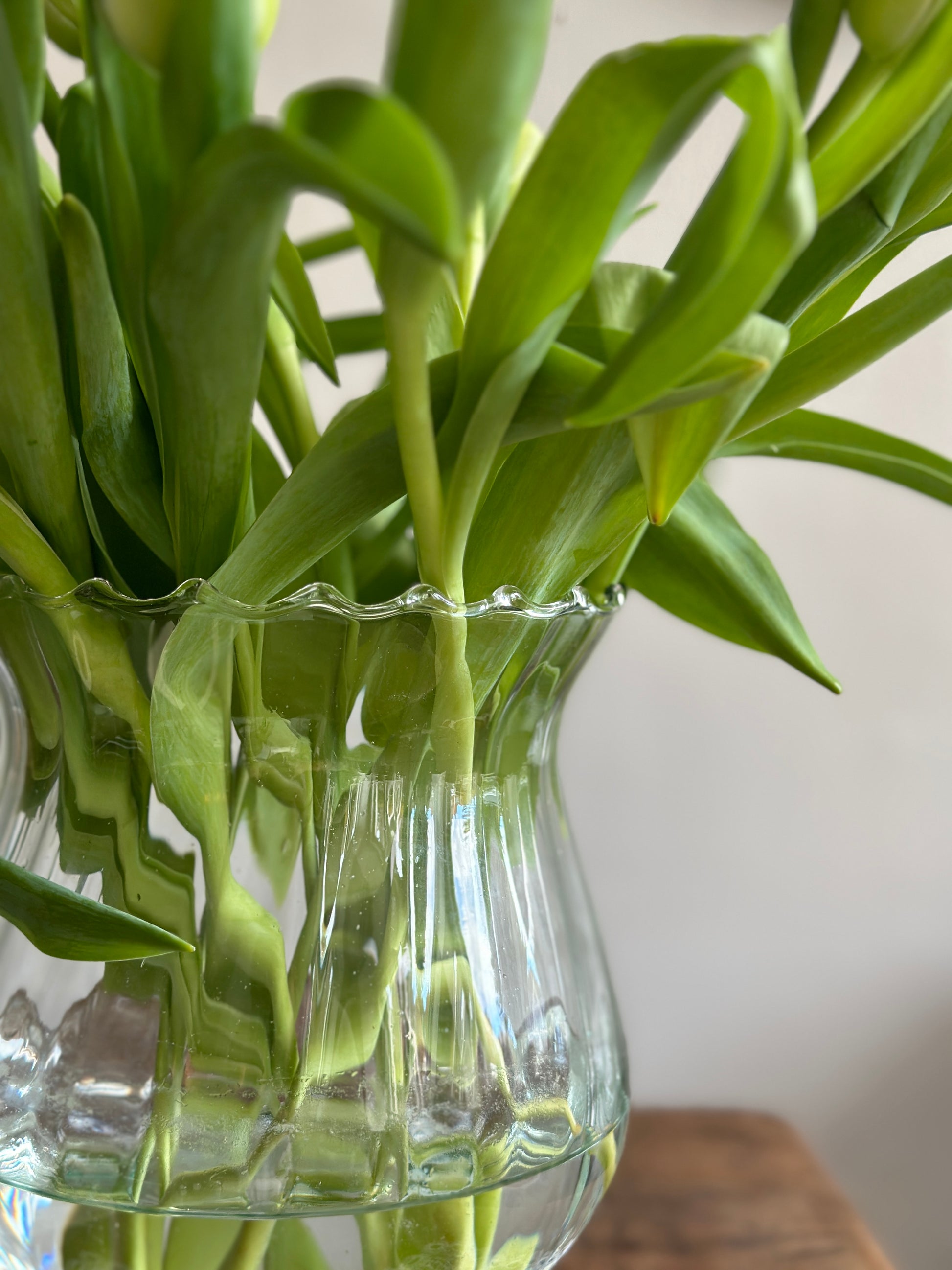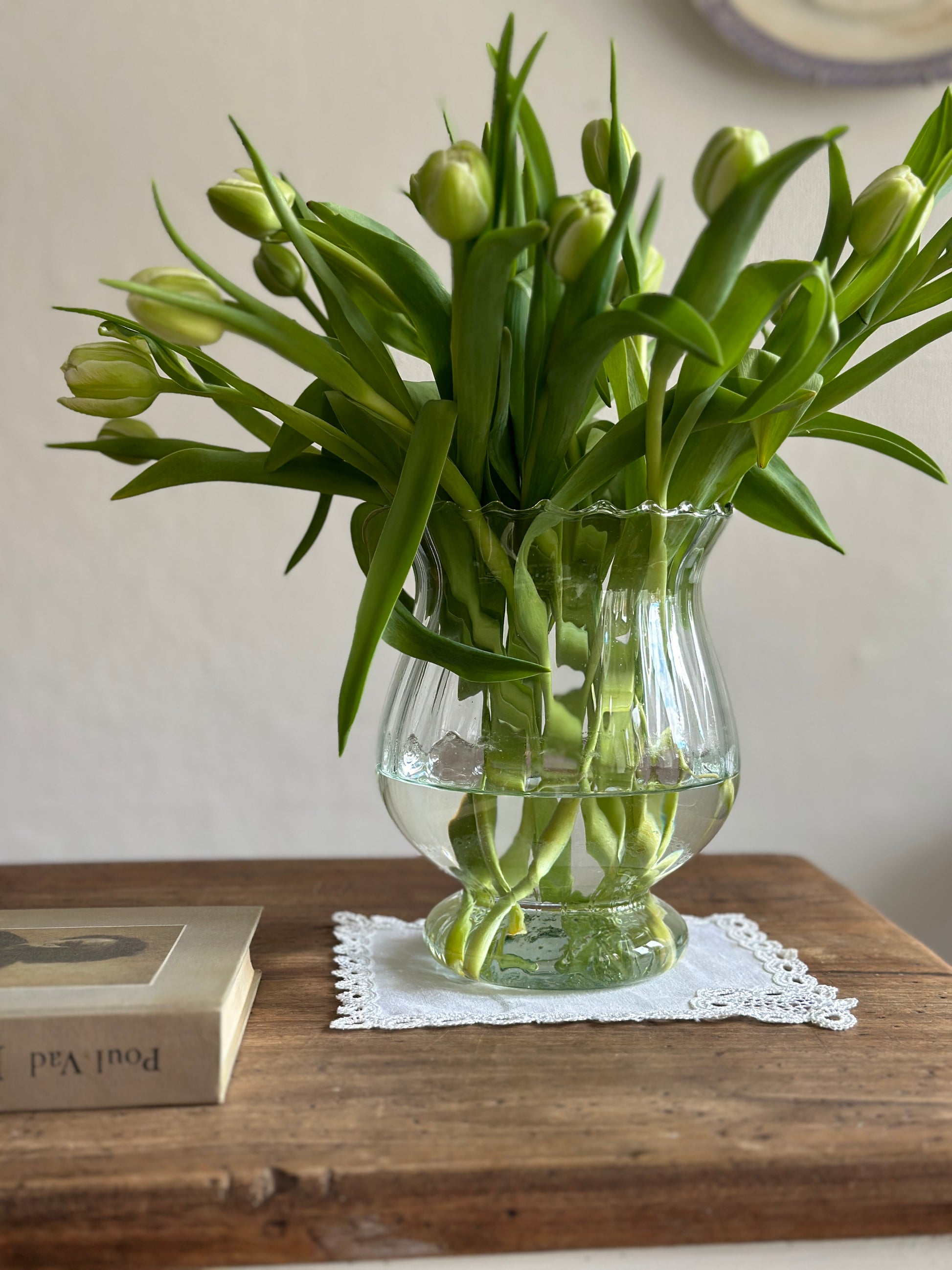 Smukkeste glasvase i swirl på fod og med bølget kant