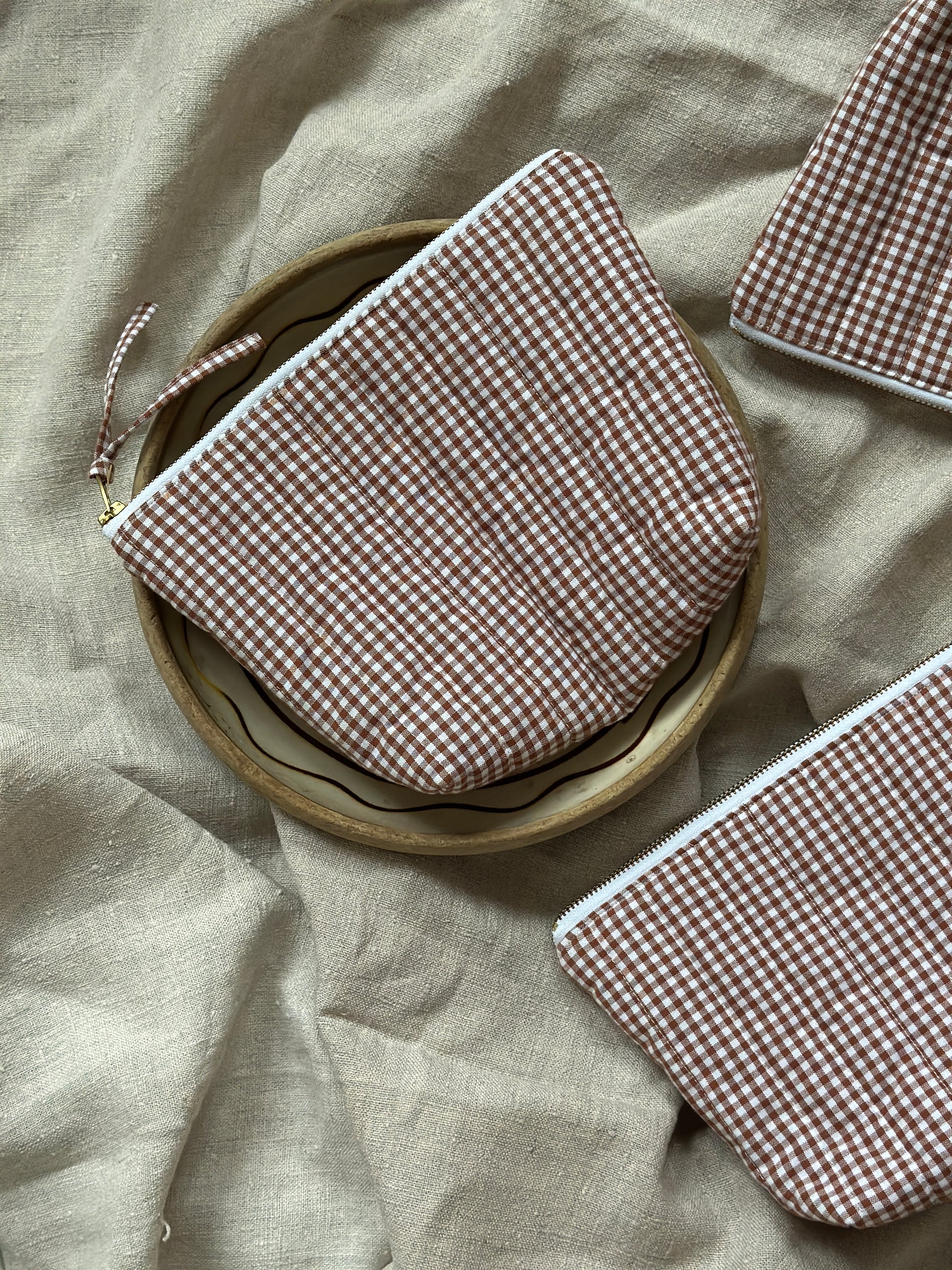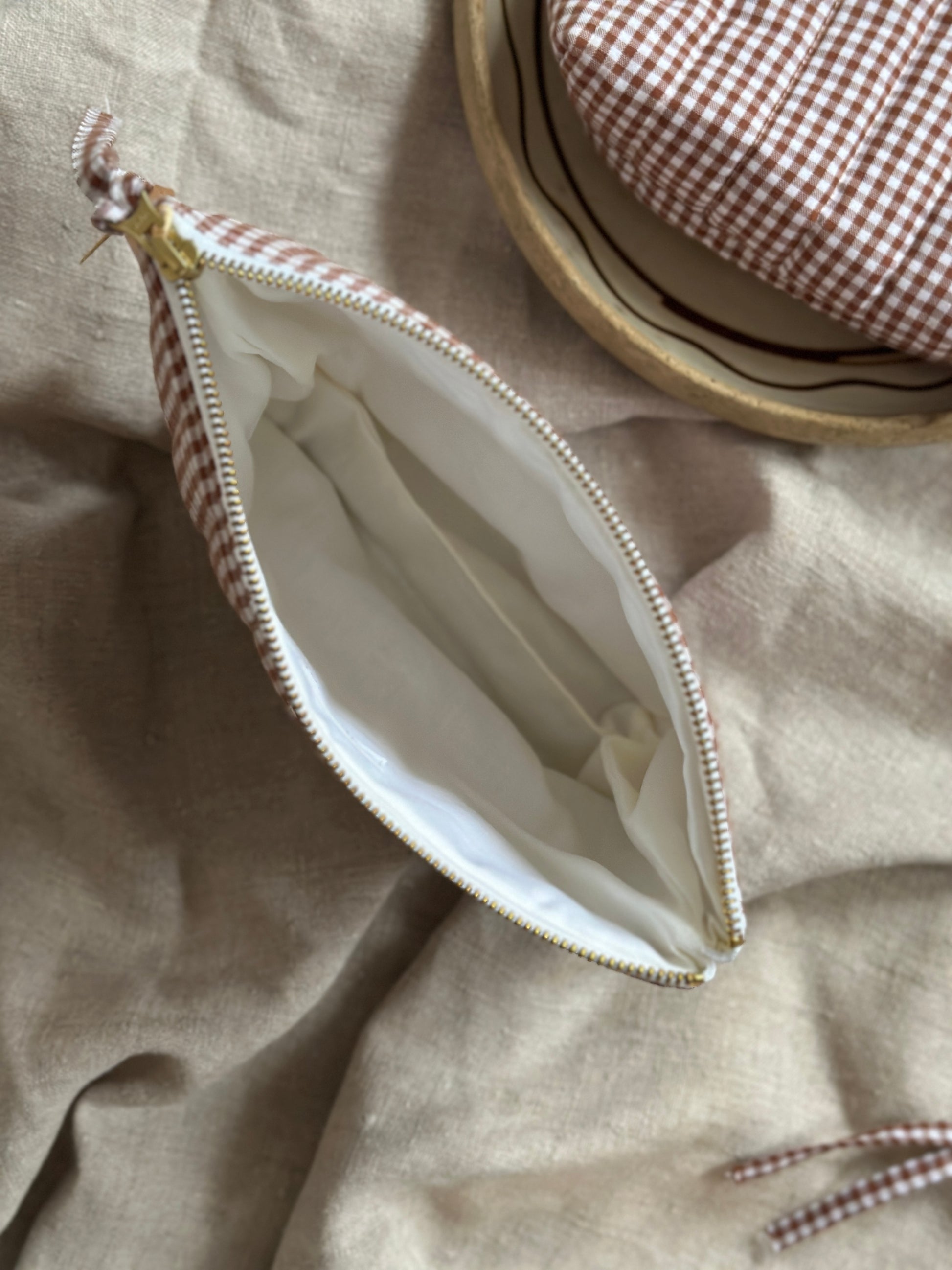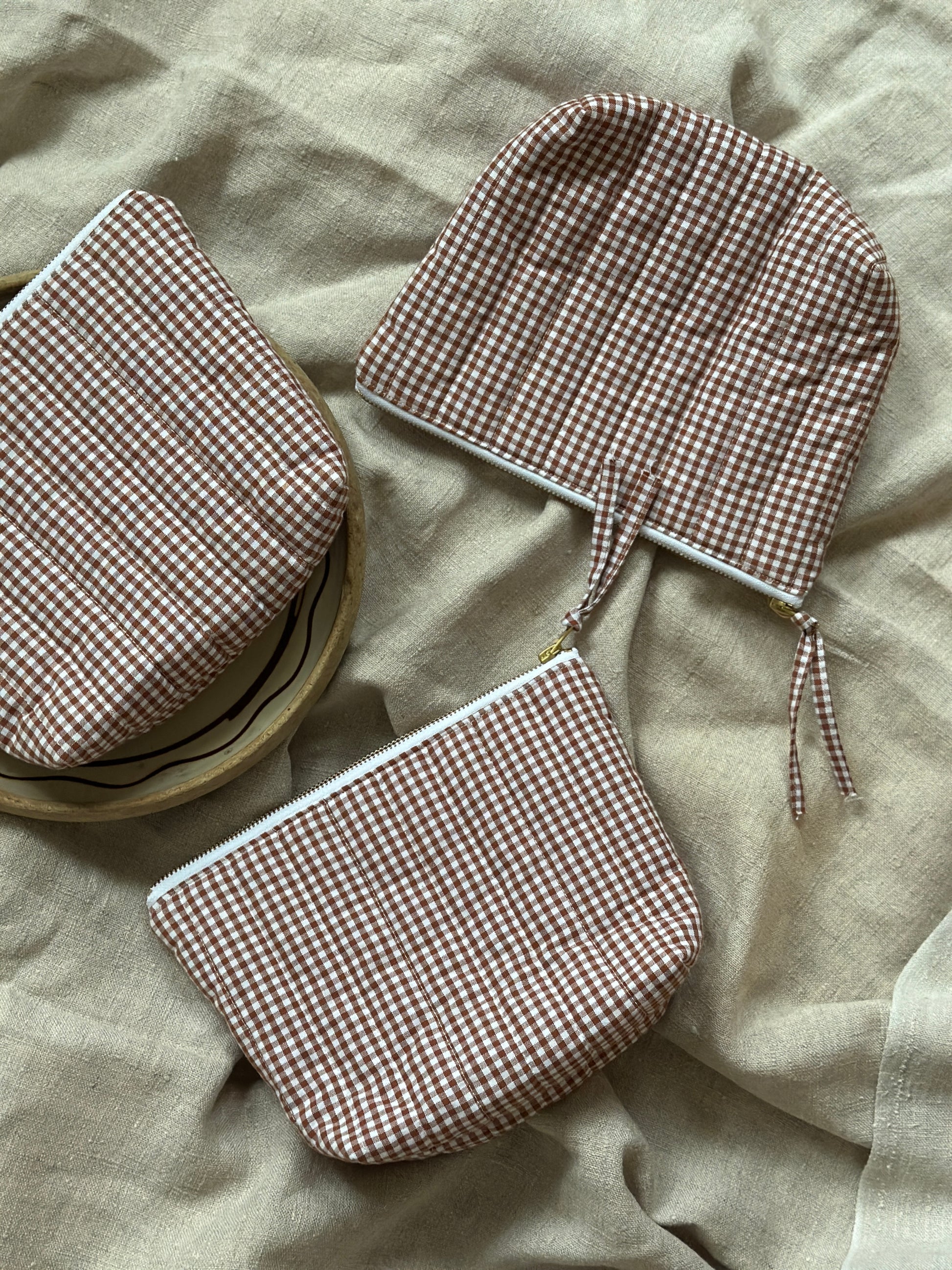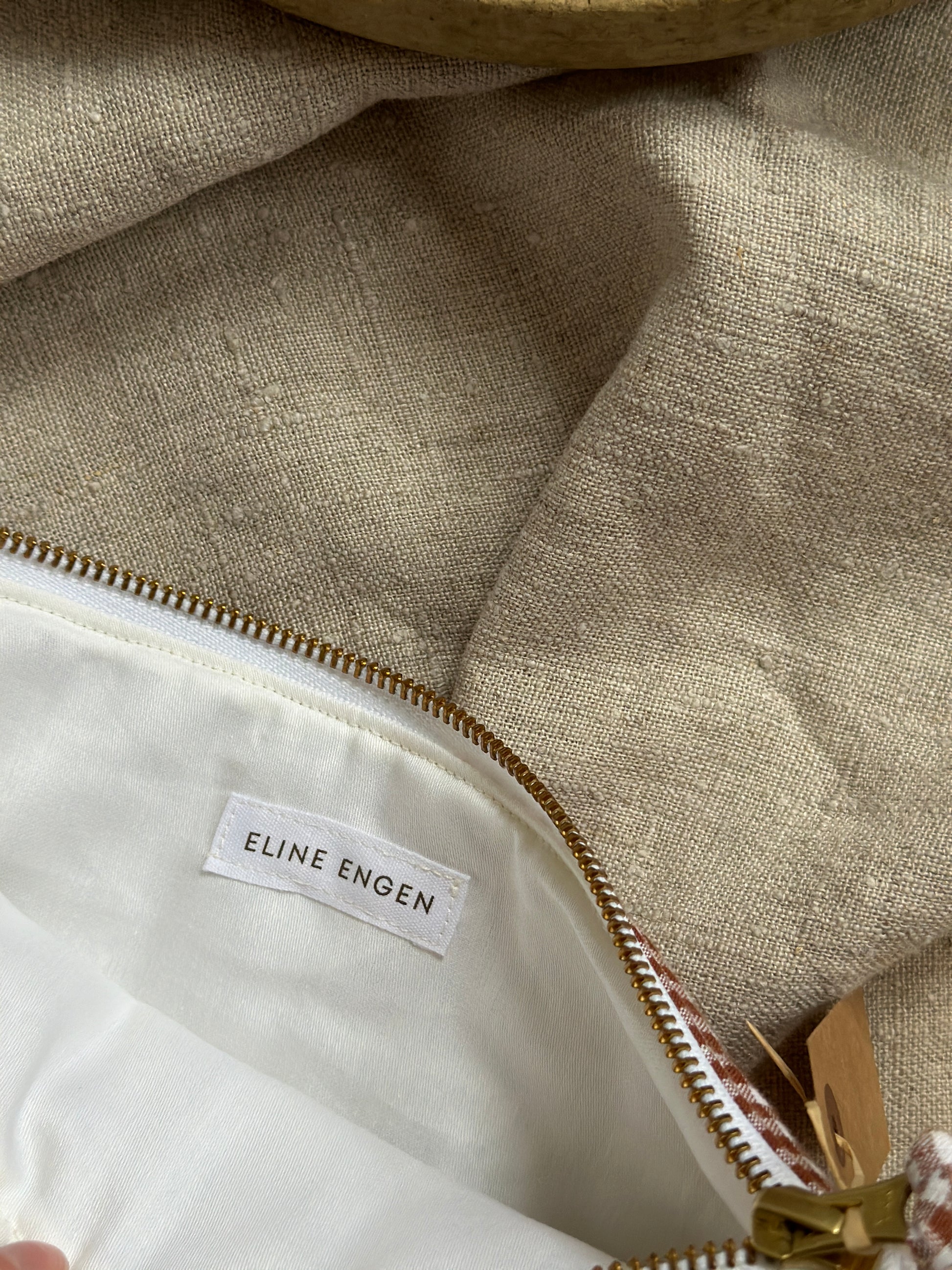 Toilettaske i bordeaux og hvide tern fra danske Eline Engen. I 100& bomuld og håndsyet på Fyn